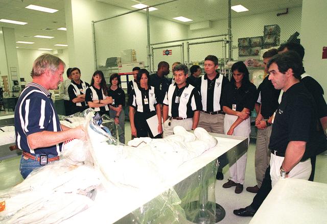 KENNEDY SPACE CENTER, FLA. -- In the Space Station Processing Facility, Ron Woods (left) shows members of the 1998 astronaut candidate class (group 17) an Apollo-style space suit and how it differs from the current suits. The class is taking part in training activities, including fire training and a flight awareness program, plus touring the OPF, VAB, SSPF, launch pads, SLF, Apollo/Saturn V Center, the crew headquarters, as well as the SSME Processing Facility. The U.S. candidates in the '98 class are Clayton C. Anderson, Lee J. Archambault, Tracy E. Caldwell (Ph.D.), Gregory E. Chamitoff (Ph.D.), Timothy J. Creamer, Christopher J. Ferguson, Michael J. Foreman, Michael E. Fossum, Kenneth T. Ham, Patricia C. Hilliard (M.D.), Gregory C. Johnson, Gregory H. Johnson, Stanley G. Love (Ph.D.), Leland D. Melvin, Barbara R. Morgan, William A. Oefelein, John D. Olivas (Ph.D.), Nicholas J.M. Patrick (Ph.D.), Alan G. Poindexter, Garrett E. Reisman (Ph.D.), Steven R. Swanson, Douglas H. Wheelock, Sunita L. Williams, Neil W. Woodward III, George D. Zamka; and the international candidates are Leopold Eyharts, Paolo Nespoli, Hans Schlegel, Roberto Vittori, Bjarni V. Tryggvason, and Marcos Pontes