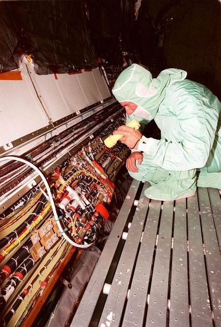 A short during liftoff of Space Shuttle Columbia in July was traced to a wire in the payload bay with damaged insulation. As a result of that problem, NASA decided to inspect much of the wiring in all four Space Shuttles and make repairs as required. Here a technician is examining the wires onboard orbiter Endeavour. The next Shuttle mission, STS-103, the Third Hubble Space Telescope Servicing Mission, is currently scheduled for launch no earlier than Nov. 19, 1999