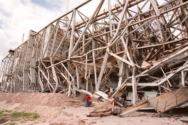 KENNEDY SPACE CENTER, FLA. -- Workers are dwarfed by the fallen 300-foot, five-million-pound Mobile Service Tower (MST) on Launch Complex 41, Cape Canaveral Air Force Station. The MST and a 200-foot-high umbilical tower nearby were demolished to make room for Lockheed Martin's 14-acre Vehicle Integration Facility (VIF), under construction. Only lightning protection towers remain standing at the site. About 200 pounds of linear-shaped charges were used to bring down the towers so that the materials can be recycled. The implosion and removal of the tower debris is expected to be completed in two months. The VIF will be used for Lockheed Martin's Atlas V Launch System.