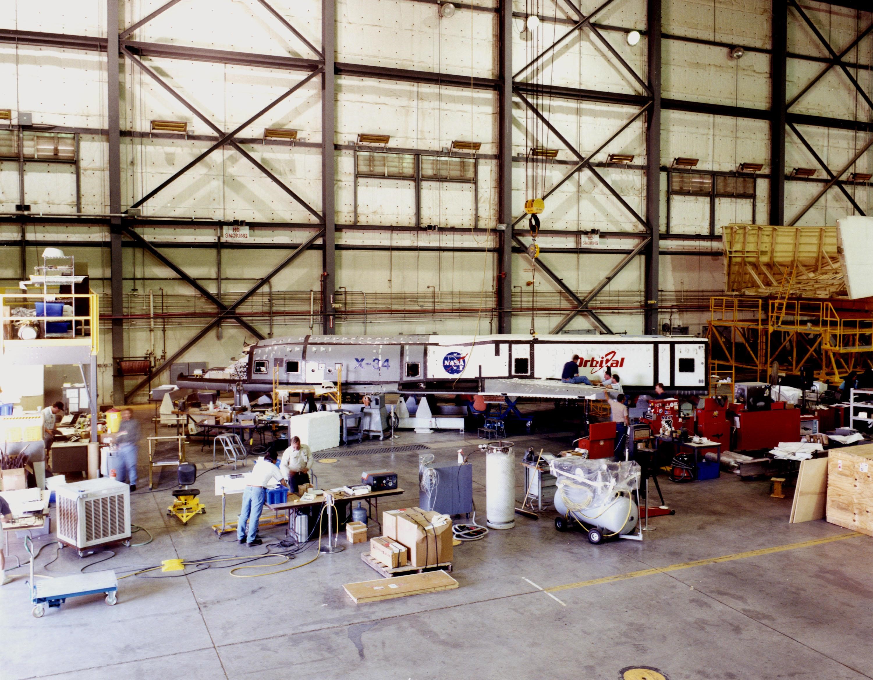 The modified X-34, known as A-1A, rests in the background of the Dryden Flight Research Center at Edwards Air Force Base, Calif., while an integrated team of KSC, Dryden Flight Research Center and Orbital Sciences Corporation engineers and technicians bring the X-34 A-1A vehicle closer to test flight readiness. Since September, eight NASA engineering technicians from KSC's Engineering Prototype Lab have assisted in the complex process of converting the X-34 A-1 vehicle from captive carry status to unpowered flight status, the A-1A. The X-34 is 58.3 feet long, 27.7 feet wide from wing tip to wing tip, and 11.5 feet tall from the bottom of the fuselage to the top of the tail. The autonomously operated technology demonstrator will be air-launched from an L-1011 airplane and should be capable of flying eight times the speed of sound, reaching an altitude of 250,000 feet. The X-34 Project is managed by NASA's Marshall Space Flight Center in Huntsville, Ala