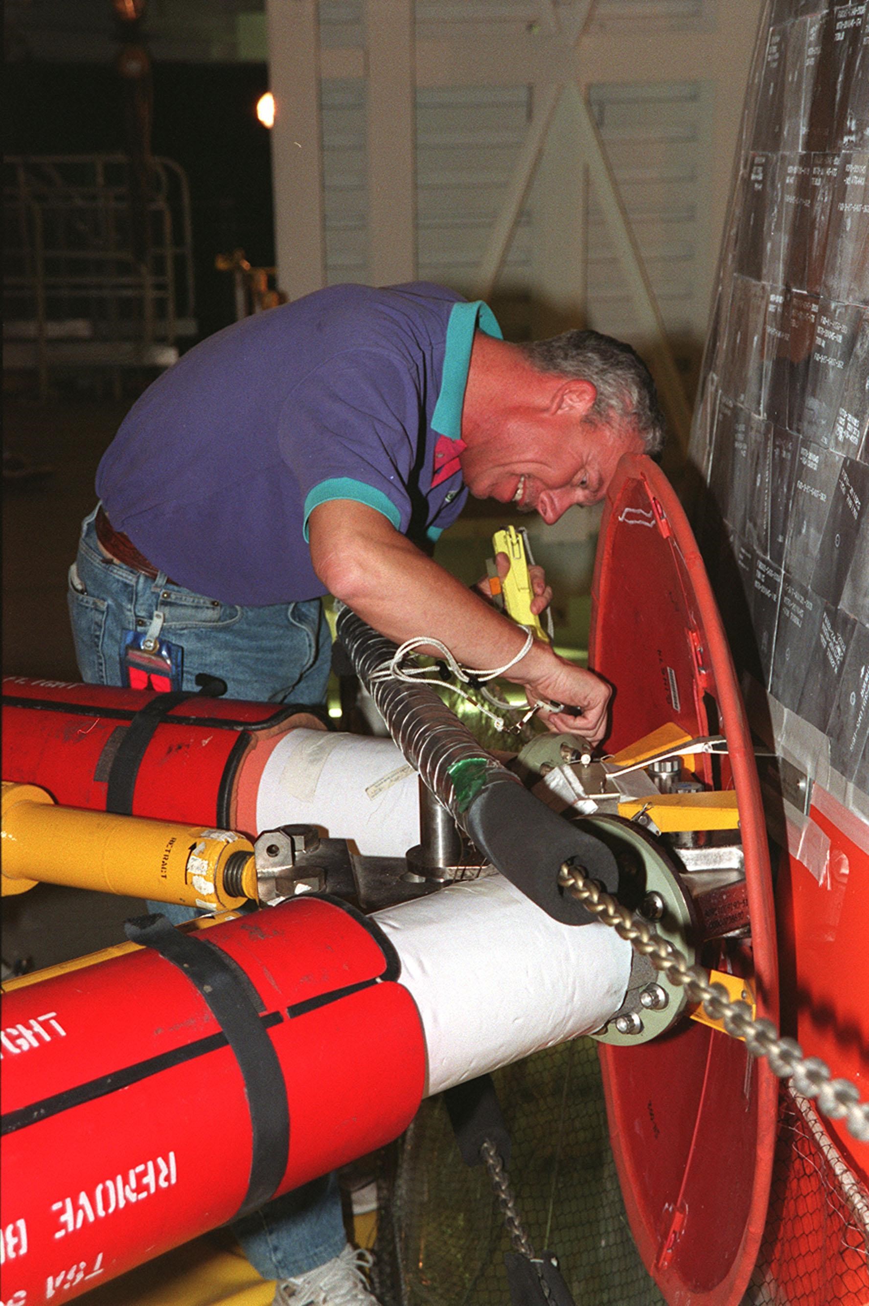 KENNEDY SPACE CENTER, FLA. -- In the Vehicle Assembly Building, Ken Strite, NASA Quality Control, inspects the connection between Space Shuttle Discovery and the external tank that will be used to launch mission STS-103 in early December. This 10-day mission is designed to replace aging parts on the nine-year-old Hubble Space Telescope and to upgrade some of its functioning systems. During the flight, the astronaut crew will replace all six of the observatory's gyroscopes, a fine guidance sensor, its main computer, and other equipment
