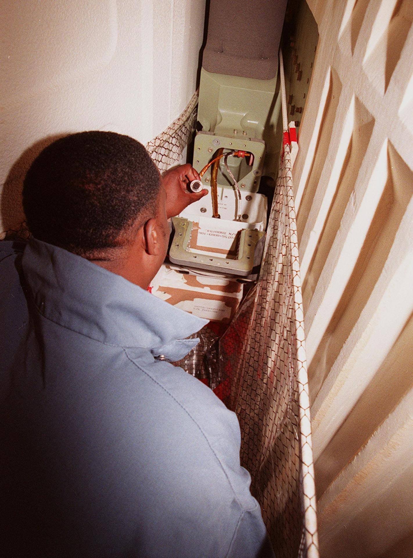 KENNEDY SPACE CENTER, FLA. -- Rodney Wilson, with United Space Alliance, inspects the range safety cable between the external tank and solid rocket boosters (SRB) on Space Shuttle Discovery. The cable, which relays a redundant emergency destruction signal between the SRBs in the unlikely event of a contingency, was damaged during close-out operations and is being replaced. Discovery's processing schedule leads to a target launch date of Dec. 6