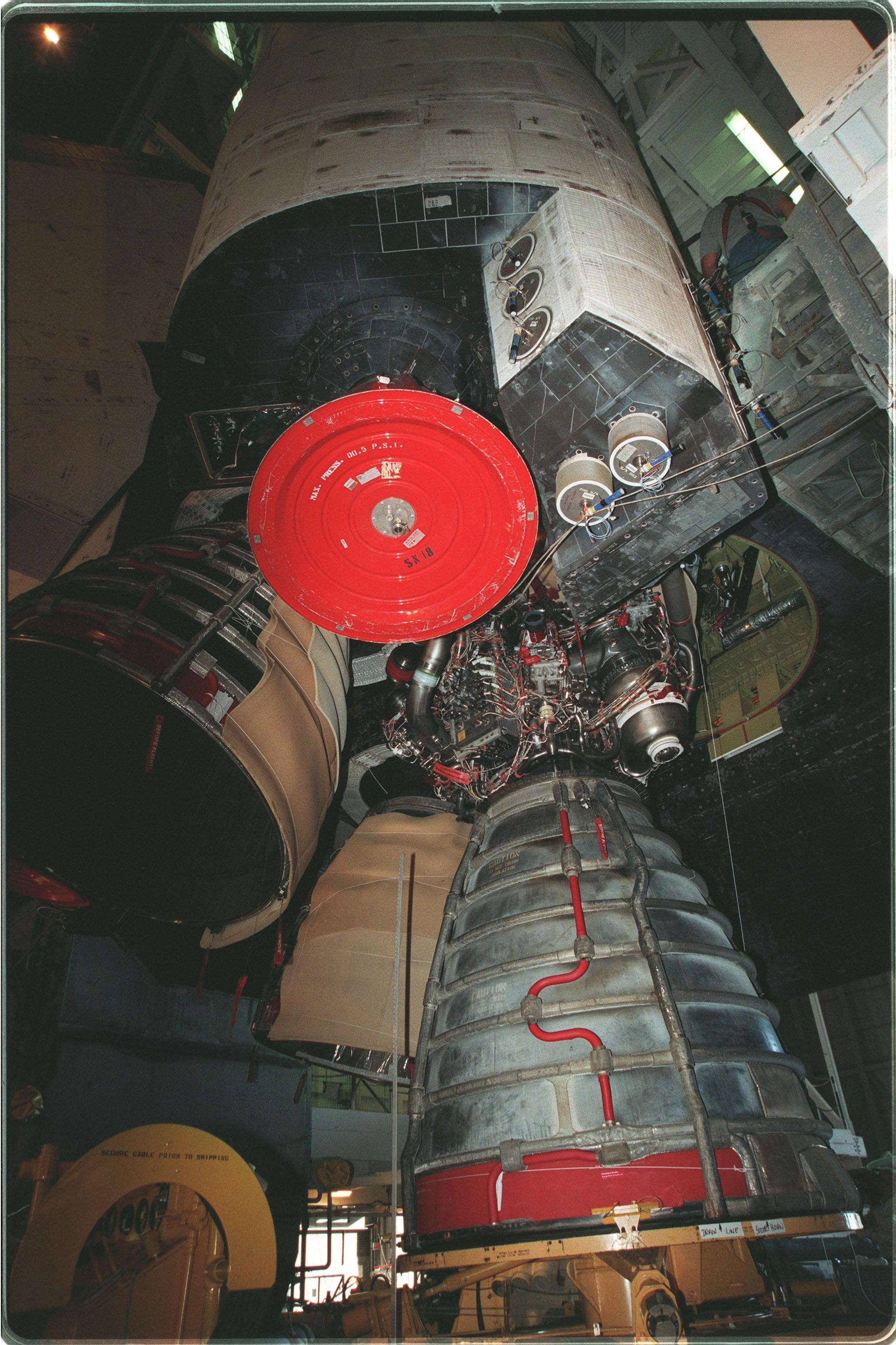 KENNEDY SPACE CENTER, FLA. -- Inside the Vehicle Assembly Building, main engine No. 3 (bottom right) is being removed from Space Shuttle Discovery. Above it are (left) the Orbital Maneuvering System (OMS) engine, the reaction control thrusters (right), and the OMS pod (top). Last week, Shuttle managers determined that the engine was not acceptable for flight because a half-inch-long broken drill bit is lodged in the engine's coolant cavity. Therefore, the engine is being replaced. The Shuttle is expected to roll out to the pad at 2 a.m. Saturday morning, Nov. 13. The STS-103 launch is now targeted for Dec. 6 at 2:37 a.m. EST. The 10-day mission is expected to conclude at KSC on Dec. 16 with a 12:45 a.m. landing