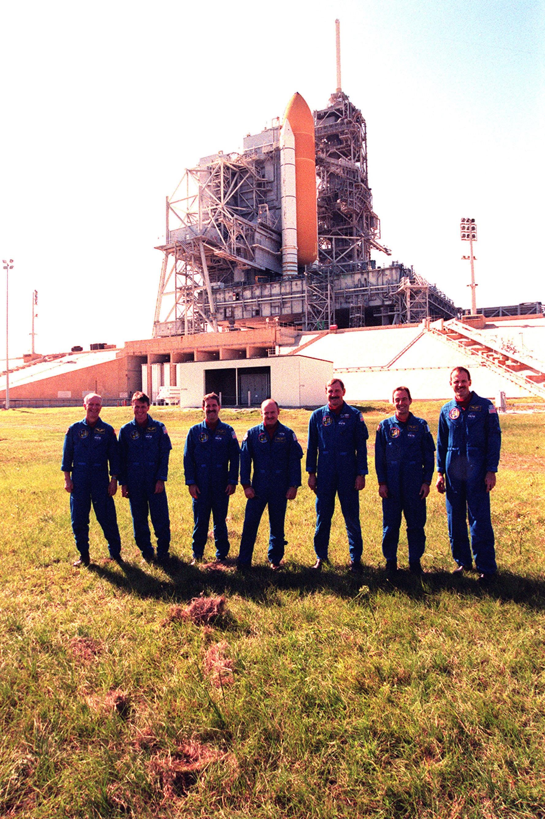 During Terminal Countdown Demonstration Test (TDCT) activities at Launch Pad 39B, the STS-103 crew pose in front of the flame trench, which is situated underneath the Mobile Launcher Platform holding Space Shuttle Discovery. Standing left to right are Mission Specialists Claude Nicollier of Switzerland, who is with the European Space Agency (ESA), C. Michael Foale (Ph.D.), John M. Grunsfeld (Ph.D.), Pilot Scott J. Kelly, Commander Curtis L. Brown Jr., and Mission Specialists Jean-François Clervoy of France, also with ESA, and Steven L. Smith. One of the solid rocket boosters and the external tank that are attached to Discovery can be seen in the photo. The flame trench is made of concrete and refractory brick, and contains an orbiter flame deflector on one side and solid rocket booster flame deflector on the other. The deflectors protect the flame trench floor and pad surface from the intense heat of launch. The TCDT provides the crew with emergency egress training, opportunities to inspect their mission payloads in the orbiter's payload bay, and simulated countdown exercises. STS-103 is a "call-up" mission due to the need to replace and repair portions of the Hubble Space Telescope, including the gyroscopes that allow the telescope to point at stars, galaxies and planets. The STS-103 crew will be replacing a Fine Guidance Sensor, an older computer with a new enhanced model, an older data tape recorder with a solid-state digital recorder, a failed spare transmitter with a new one, and degraded insulation on the telescope with new thermal insulation. The crew will also install a Battery Voltage/Temperature Improvement Kit to protect the spacecraft batteries from overcharging and overheating when the telescope goes into a safe mode. Four EVA's are planned to make the necessary repairs and replacements on the telescope. The mission is targeted for launch Dec. 6 at 2:37 a.m. EST