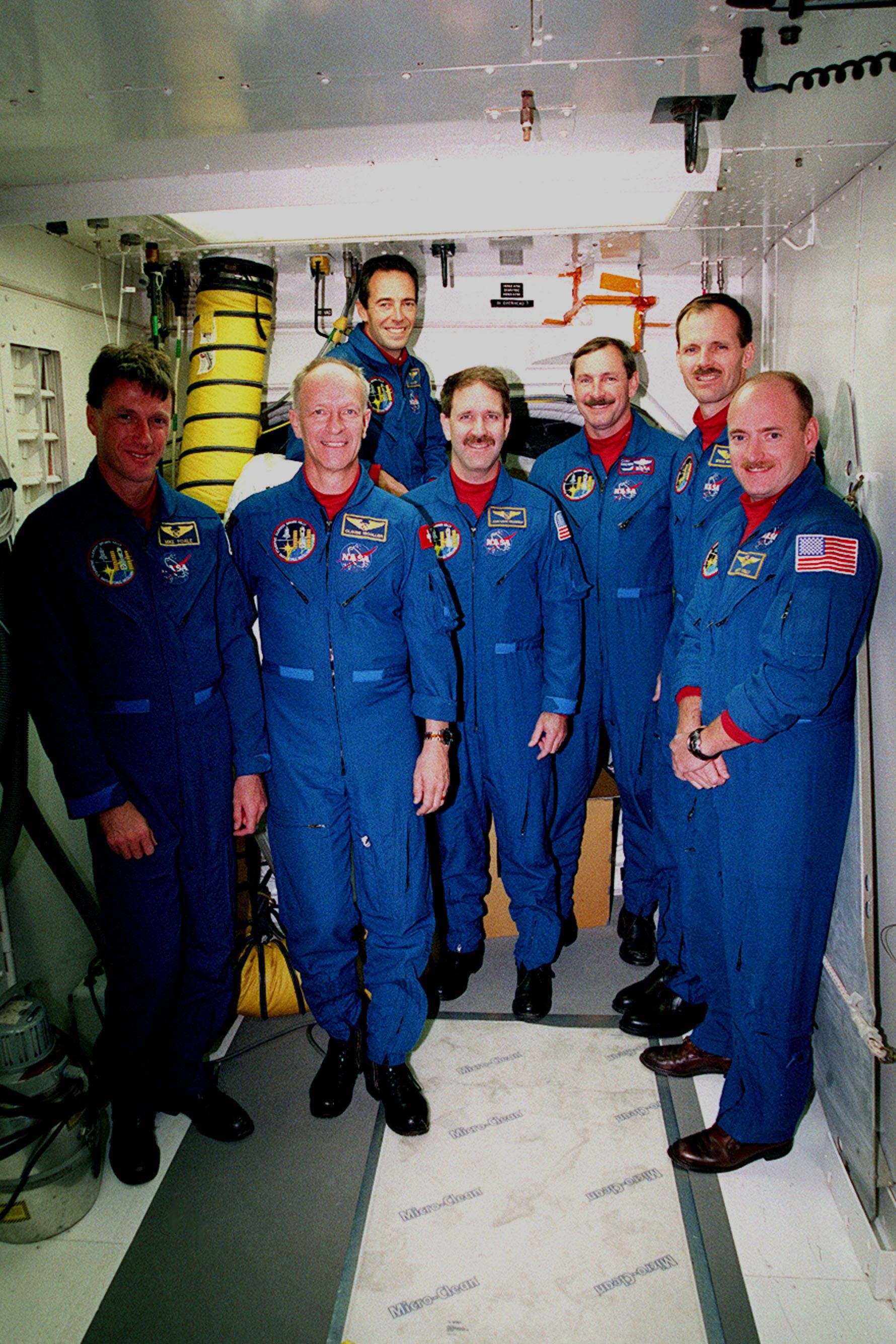 As part of Terminal Countdown Demonstration Test (TCDT) activities, the STS-103 crew inspect the "white room," an environmentally controlled chamber at the end of the orbiter access arm through which the crew enters the orbiter. Standing from left to right are Mission Specialists C. Michael Foale (Ph.D.), Claude Nicollier of Switzerland, Jean-François Clervoy of France, John M. Grunsfeld (Ph.D.), Commander Curtis L. Brown Jr., Mission Specialist Steven L. Smith, and Pilot Scott J. Kelly. Clervoy and Nicollier are with the European Space Agency. The TCDT provides the crew with the emergency egress training, opportunities to inspect their mission payloads in the orbiter's payload bay, and simulated countdown exercises. STS-103 is a "call-up" mission due to the need to replace and repair portions of the Hubble Space Telescope, including the gyroscopes that allow the telescope to point at stars, galaxies and planets. The STS-103 crew will be replacing a Fine Guidance Sensor, an older computer with a new enhanced model, an older data tape recorder with a solid-state digital recorder, a failed spare transmitter with a new one, and degraded insulation on the telescope with new thermal insulation. The crew will also install a Battery Voltage/Temperature Improvement Kit to protect the spacecraft batteries from overcharging and overheating when the telescope goes into a safe mode. Four EVA's are planned to make the necessary repairs and replacements on the telescope. The mission is targeted for launch Dec. 6 at 2:37 a.m. EST