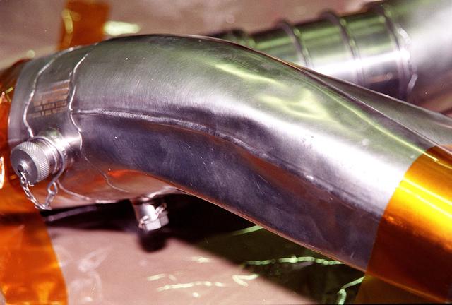 This close-up shows the 12-inch-long dent on Shuttle Discovery's main propulsion system liquid hydrogen recirculation line that was discovered during routine aft compartment inspections Tuesday, Dec. 7. The line recirculates hydrogen from the Shuttle main engines back to the external tank during prelaunch engine conditioning. The line is being replaced and managers expect the replacement work to take about 3 days, followed by system retests and final aft compartment close-outs. Preliminary assessments reflect a launch date of Space Shuttle Discovery on mission STS-103 no earlier than Dec. 16. STS-103 is the third servicing mission for the Hubble Space Telescope