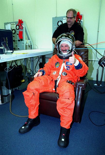 In the Operations and Checkout Building, STS-103 Commander Curtis L. Brown Jr. signals he's ready for launch while having his launch and entry suit checked by a suit technician. Other crew members are Pilot Scott J. Kelly and Mission Specialists Steven L. Smith, C. Michel Foale (Ph.D.), John M. Grunsfeld (Ph.D.), Claude Nicollier of Switzerland and Jean-François Clervoy of France. Nicollier and Clervoy are with the European Space Agency. The STS-103 mission, to service the Hubble Space Telescope, is scheduled for launch Dec. 17 at 8:47 p.m. EST from Launch Pad 39B. Mission objectives include replacing gyroscopes and an old computer, installing another solid state recorder, and replacing damaged insulation in the telescope. After the 8-day, 21-hour mission, Discovery is expected to land at KSC Sunday, Dec. 26, at about 6:30 p.m. EST