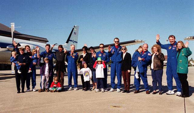 The STS-103 crew pose for a group portrait with their families and loved ones on the runway at Patrick Air Force Base. They are preparing to board an airplane that will return them to their home base at the Johnson Space Center in Houston following the successful completion of their mission. From left to right, the crew members are Mission Specialists John M. Grunsfeld (Ph.D.), C. Michael Foale (Ph.D.), Claude Nicollier of Switzerland, Jean-François Clervoy of France, and Steven L. Smith; Pilot Scott J. Kelly; and Commander Curtis L. Brown Jr. Discovery landed in darkness the previous evening, Dec. 27, on runway 33 at KSC's Shuttle Landing Facility at 7:00:47 p.m. EST. This was the first time that a Shuttle crew spent the Christmas holiday in space. The STS-103 mission supplied the Hubble Space Telescope with six new gyroscopes, six new voltage/temperature improvement kits, a new onboard computer, a new solid state recorder and new data transmitter, and a new fine guidance sensor along with new insulation on parts of the orbiting telescope. This was the 96th flight in the Space Shuttle program and the 27th for the orbiter Discovery
