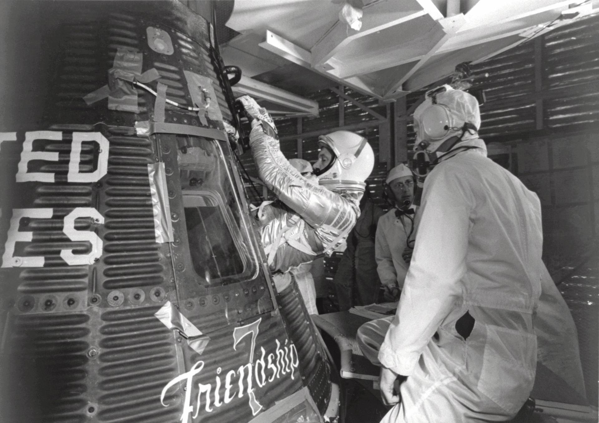 CAPE CANAVERAL, Fla. -- Astronaut John H. Glenn Jr. enters his Mercury capsule, "Friendship 7," as he prepares for launch of the Mercury-Atlas rocket. On February 20, 1962, Glenn lifted off into space aboard his Mercury Atlas 6 MA-6 rocket and became the first American to orbit the Earth. After orbiting the Earth 3 times, Friendship 7 landed in the Atlantic Ocean 4 hours, 55 minutes and 23 seconds later, just East of Grand Turk Island in the Bahamas. Glenn and his capsule were recovered by the Navy Destroyer Noa, 21 minutes after splashdown. Photo credit: NASA