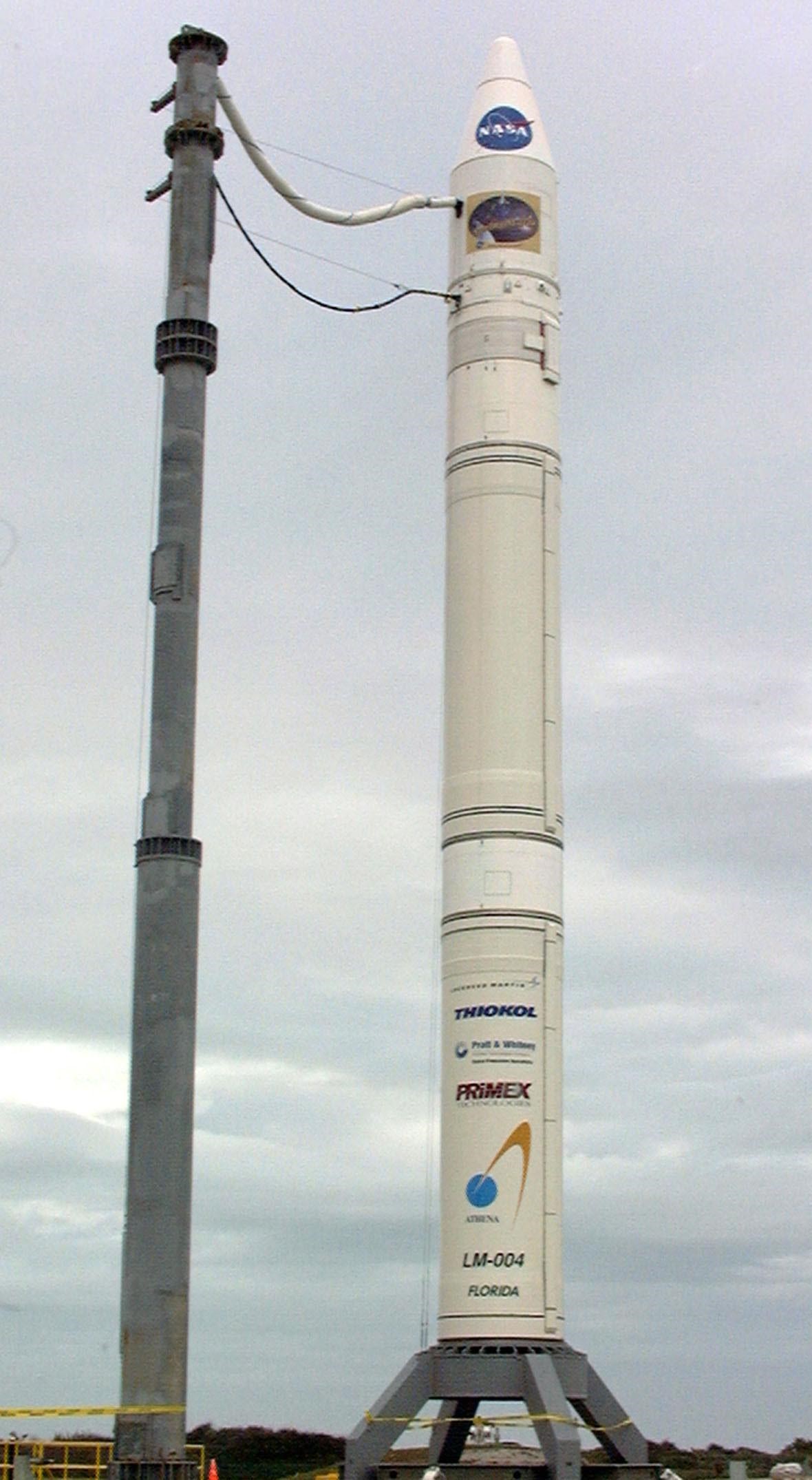 NASA’s Lunar Prospector is readied for launch as its gantry-like service tower is rolled back again at Cape Canaveral Air Station’s Launch Complex 46. The launch, previously scheduled for Jan. 5, was postponed one day due to a problem with a range safety radar located at Patrick Air Force Base, Fla. Lunar Prospector, built for the NASA Ames Research Center by Lockheed Martin, is a spin-stabilized spacecraft designed to provide NASA with the first global maps of the Moon’s surface and its gravitational magnetic fields, as well as look for the possible presence of ice near the lunar poles. It will orbit the Moon at an altitude of approximately 63 miles during a one-year mission. The launch of Lunar Prospector is now scheduled for Jan. 6, 1998 at 9:28 p.m. EST