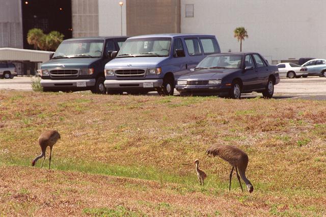 While the sandhill crane parents search for food in front of the Vehicle Assembly Building, their still-featherless baby nearby tests its voice. The cranes have been a constant sight in the Launch Complex 39 area during the month of May. Sandhill cranes range from Siberia, Alaska and Arctic islands to Michigan, Minnesota and California; from Florida to Texas. They prefer large freshwater marshes, prairie ponds and marshy tundra. KSC shares a boundary with the Merritt Island National Wildlife Refuge, which encompasses 92,000 acres that are a habitat for more than 331 species of birds, 31 mammals, 117 fishes, and 65 amphibians and reptiles. The marshes and open water of the refuge provide wintering areas for 23 species of migratory waterfowl, as well as a year-round home for great blue herons, great egrets, wood storks, cormorants, brown pelicans and other species of marsh and shore birds, as well as a variety of insects