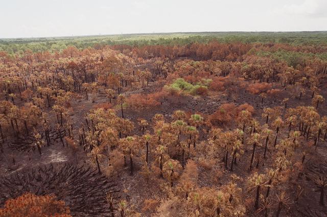 KENNEDY SPACE CENTER, FLA. -- Burned out woods on Kennedy Space Center illustrate the hazardous fire conditions that exist throughout Central Florida. The site is between Kennedy Parkway North and the Indian River