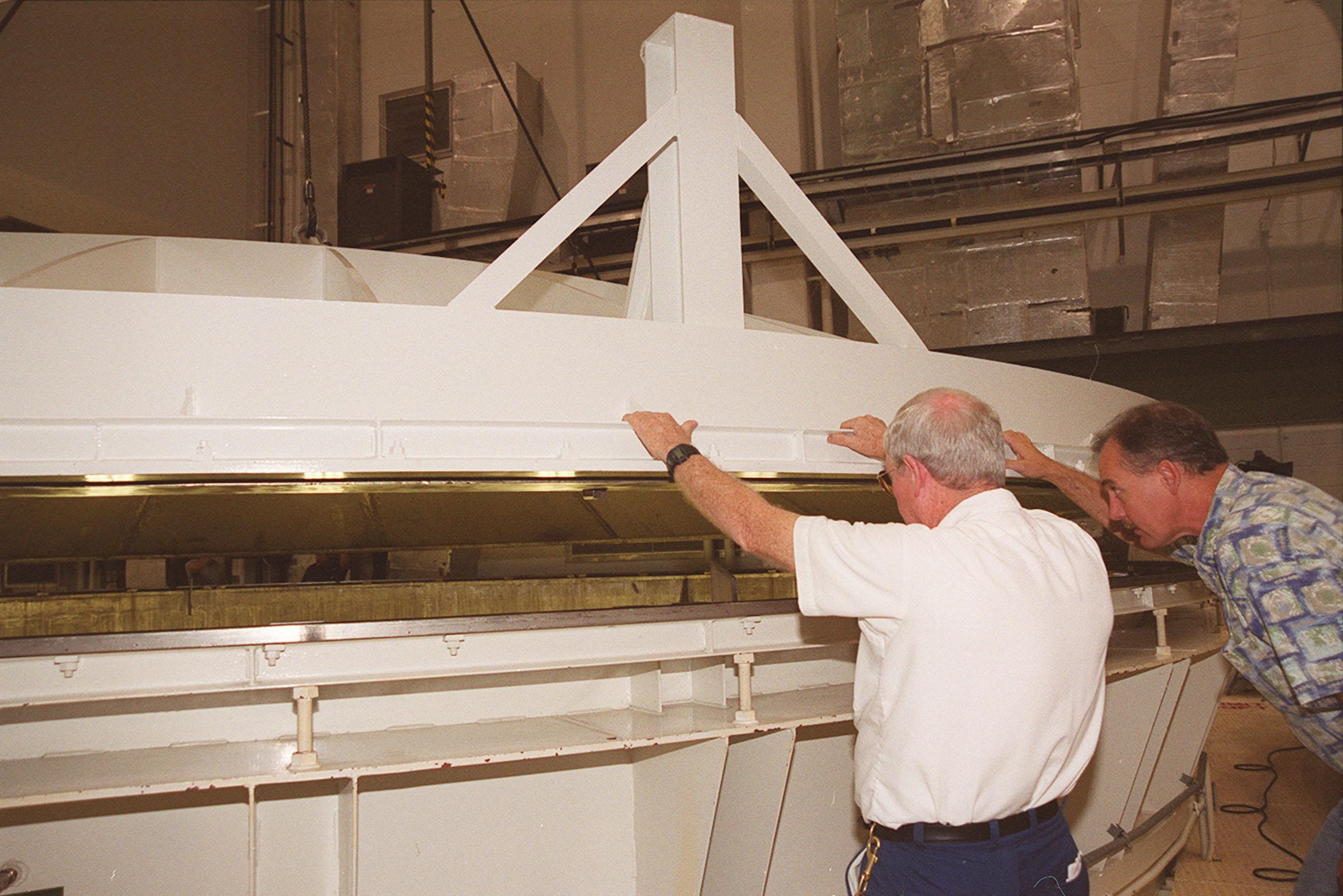 KENNEDY SPACE CENTER, FLA. -- Workers in the Operations and Checkout Building check the placement of the lid on the vacuum chamber containing the U.S. Lab, a component of the International Space Station. The 32,000-pound scientific research lab, named Destiny, is the first Space Station element to spend seven days in the renovated vacuum chamber for a leak test. Destiny is scheduled to be launched on Shuttle mission STS-98, the 5A assembly mission, targeted for Jan. 18, 2001. During the mission, the crew will install the Lab in the Space Station during a series of three space walks. The STS-98 mission will provide the Station with science research facilities and expand its power, life support and control capabilities. The U.S. Lab module continues a long tradition of microgravity materials research, first conducted by Skylab and later Shuttle and Spacelab missions. Destiny is expected to be a major feature in future research, providing facilities for biotechnology, fluid physics, combustion, and life sciences research