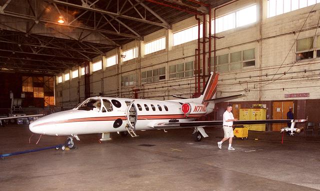In a hangar at Cape Canaveral Air Force Station, a Cessna Citation aircraft has been fitted on the wings with devices that measure electric fields (black circles shown behind the open door) and with cloud physics probes (under the body and wings) that measure the size, shape and number of ice and water particles in clouds. The plane is being flown into anvil clouds in the KSC area as part of a study to review and possibly modify lightning launch commit criteria. The weather study could lead to improved lightning avoidance rules and fewer launch scrubs for the Space Shuttle and other launch vehicles on the Eastern and Western ranges.; More information about the study can be found in <a href="http://www-pao.ksc.nasa.gov/kscpao/release/2000/56-00.htm">Release No. 56-00</a>