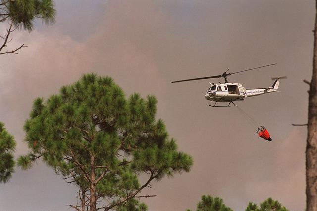 A NASA helicopter flies toward the source of the smoke to drop its load of water on a wildfire at KSC. Before being extinguished, the fire burned about 20 acres at a site near gate 2C on Kennedy Parkway North (route 3)