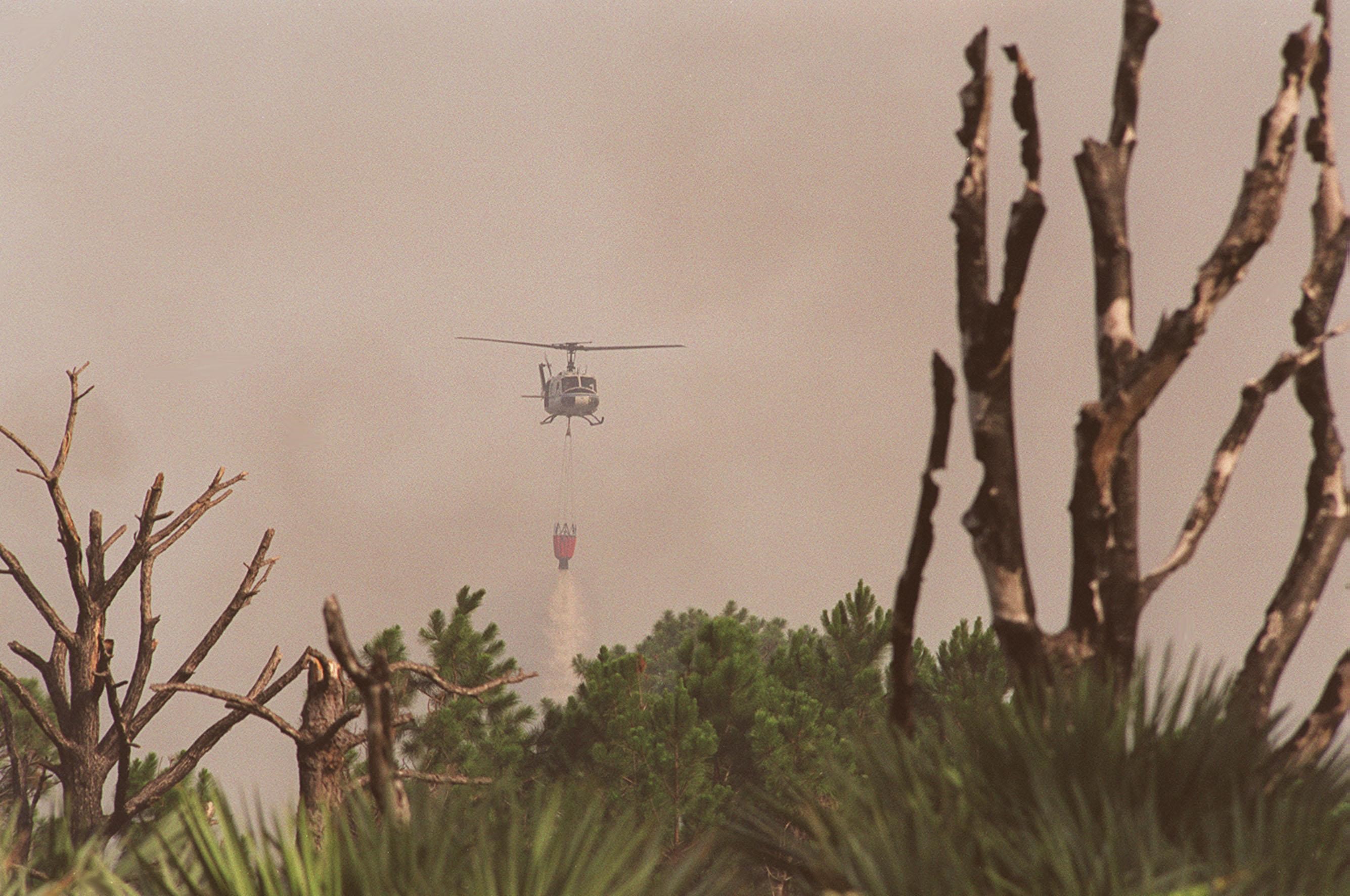A NASA helicopter drops its cargo of water onto a wildfire at KSC. Before being extinguished, the fire burned about 20 acres at a site near gate 2C on Kennedy Parkway North (route 3)