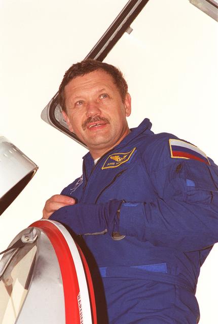 STS-106 Mission Specialist Boris V. Morukov, eager to start Terminal Countdown Demonstration Test (TCDT)activities, arrives at the KSC Shuttle Landing Facility aboard a T-38 jet aircraft. As part of TCDT, he and the rest of the crew will practice emergency egress from the Fixed Service Structure and driving the M113 armored carrier, plus take part in a dress rehearsal for launch with a simulated countdown. STS-106 is scheduled to launch Sept. 8, 2000, at 8:31 a.m. EDT from Launch Pad 39B. On the 11-day mission, the seven-member crew will perform support tasks on orbit, transfer supplies and prepare the living quarters in the newly arrived Zvezda Service Module. The first long-duration crew, dubbed “Expedition One,” is due to arrive at the Station in late fall