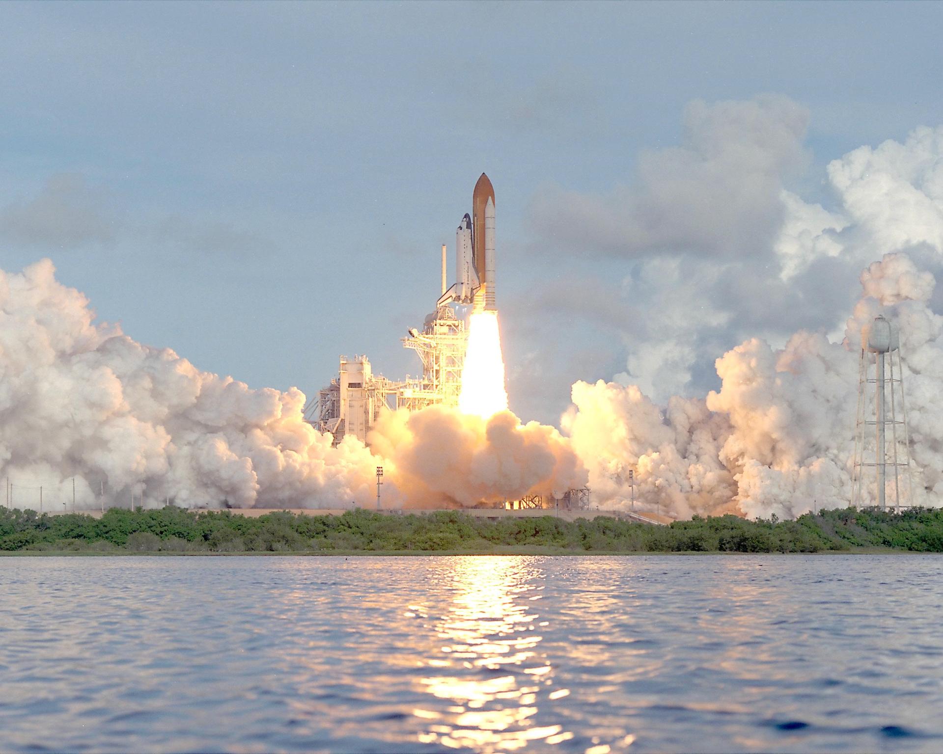 KENNEDY SPACE CENTER, Fla. -- The clouds of steam and smoke generated from the launch of Space Shuttle Atlantis seem to blend with the sky. The launch is reflected in waters near Launch Pad 39B. The perfect on-time liftoff of Atlantis on mission STS-106 occurred at 8:45:47 a.m. EDT. On the 11-day mission to the International Space Station, the seven-member crew will perform support tasks on orbit, transfer supplies and prepare the living quarters in the newly arrived Zvezda Service Module. The first long-duration crew, dubbed “Expedition One,” is due to arrive at the Station in late fall. Landing of Atlantis is targeted for 4:45 a.m. EDT on Sept. 19