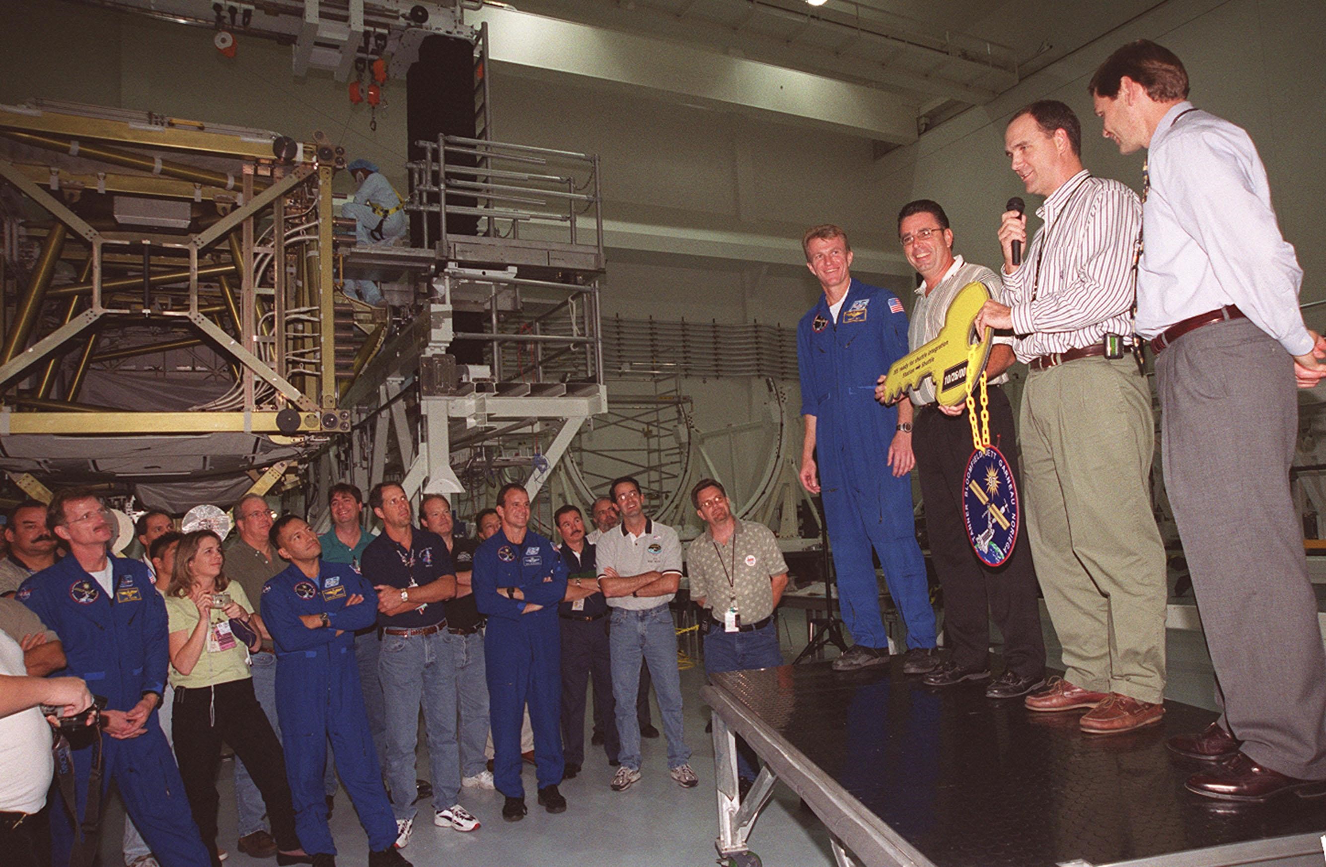Boeing workers officially turn over the P6 Integrated Truss Structure to the NASA shuttle integration team in a ceremony in the Space Station Processing Facility. A symbolic key will be presented to Brent Jett (at left), commander on mission STS-97, which is taking the P6 to the International Space Station. Next to Jett are (left to right) Bill Dowdell, mission manager; Mark Sorensen, outboard truss cargo element manager for Boeing; and John Elbon, Boeing ISS director of ground operations at KSC. Among the attendees at left watching the ceremony are other STS-97 crew members (in uniform, from left) Mission Specialists Joe Tanner and Carlos Noriega and Pilot Mike Bloomfield. Mission STS-97is the sixth construction flight to the International Space Station. Its payload includes a photovoltaic (PV) module, with giant solar arrays that will provide power to the Station. The mission involves two spacewalks to complete the solar array connections. STS-97 is scheduled to launch Nov. 30 at 10:05 p.m. EST