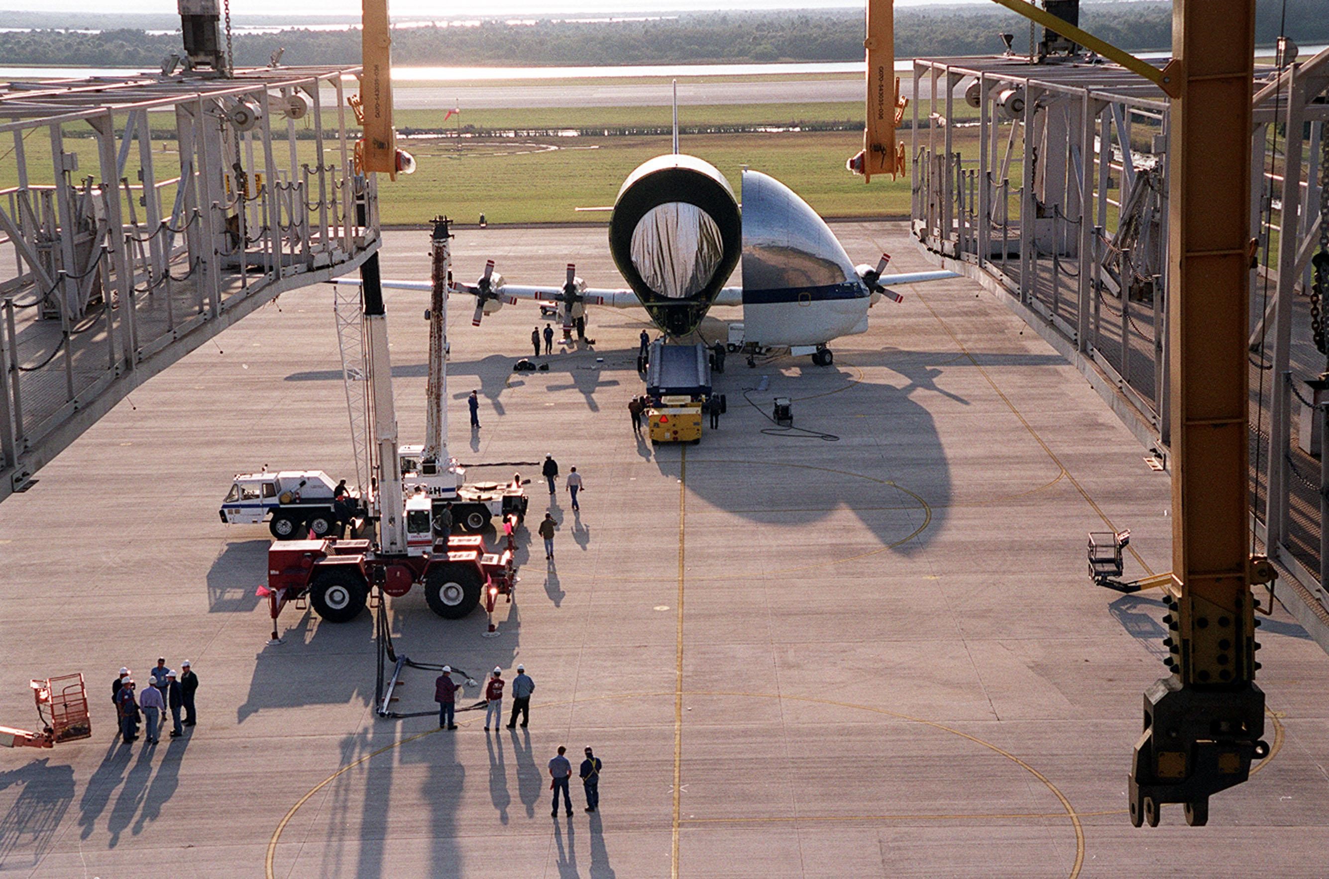 On the parking apron of the KSC Shuttle Landing Facility, near the Mate/Demate device (seen in the foreground), the opened nose of the Super Guppy aircraft reveals its cargo, the Integrated Truss Structure S3. It was built by The Boeing Co. After offloading, the S3 will be transported to the Operations and Checkout Building. The second starboard truss segment of the International Space Station, the S3 truss is scheduled to be added to the Station in April 2003