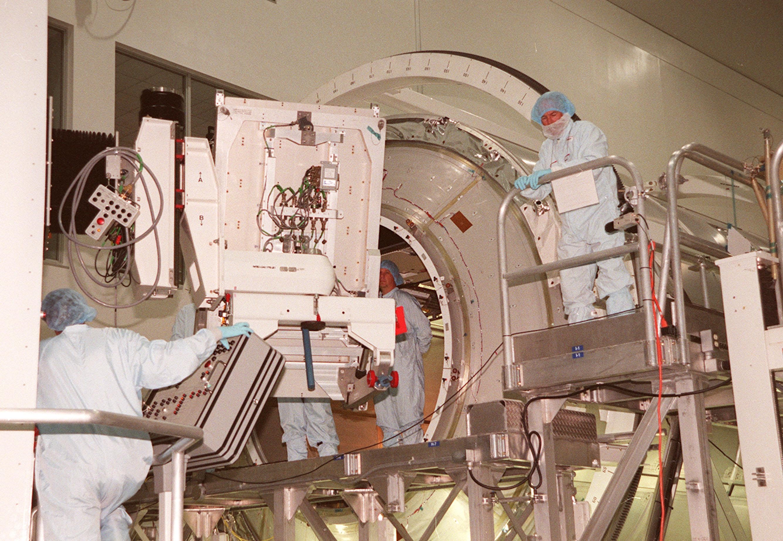 KENNEDY SPACE CENTER, FLA. -- Workers (right, left and center) in the Space Station Processing Facility wait to install a laboratory rack in the Multi-Purpose Logistics Module Leonardo (background). Leonardo is the first of three such pressurized modules that will serve as the International Space Station's “moving vans,” carrying laboratory racks filled with equipment, experiments and supplies to and from the Space Station aboard the Space Shuttle. Approximately 21 feet long and 15 feet in diameter, Leonardo will be launched on Shuttle mission STS-102 March 1, 2001. On that flight, Leonardo will be filled with equipment and supplies to outfit the U.S. laboratory module, being carried to the ISS on the Jan. 19, 2001, launch of STS-98