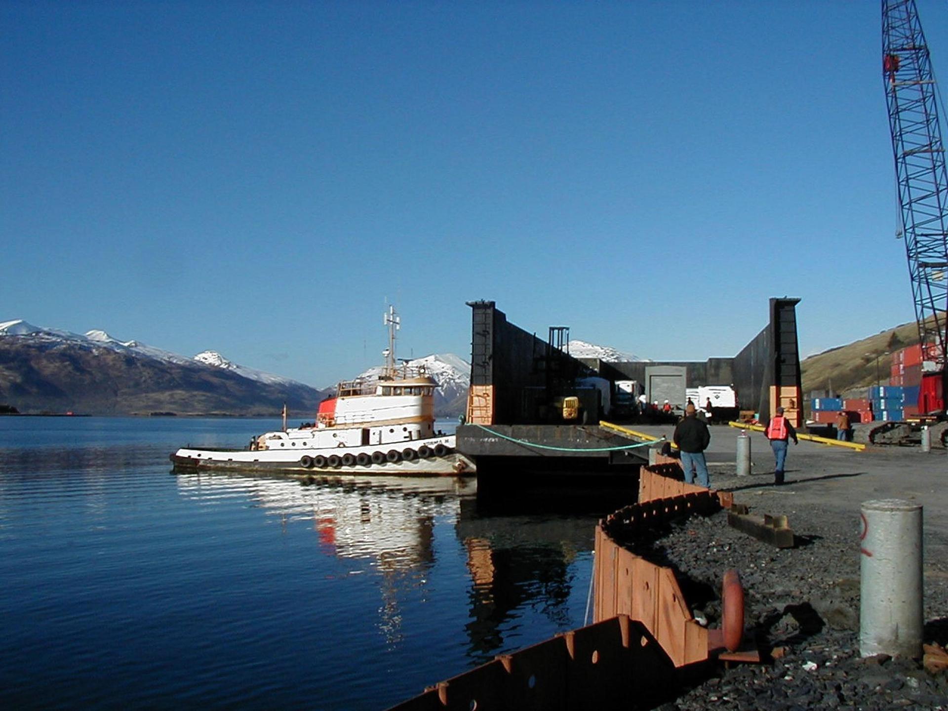 KODIAK ISLAND, Alaska -- A boat moves a ramp into place that will allow Castor 120, the first stage of the Athena 1 launch vehicle, to safely move onto the dock at Kodiak Island, Alaska, as preparations to launch Kodiak Star proceed. The first orbital launch to take place from Alaska's Kodiak Launch Complex, Kodiak Star is scheduled to lift off on a Lockheed Martin Athena I launch vehicle on Sept. 17 during a two-hour window that extends from 5:00 to 7:00 p.m. ADT. The payloads aboard include the Starshine 3, sponsored by NASA, and the PICOSat, PCSat and Sapphire, sponsored by the Department of Defense (DoD) Space Test Program.