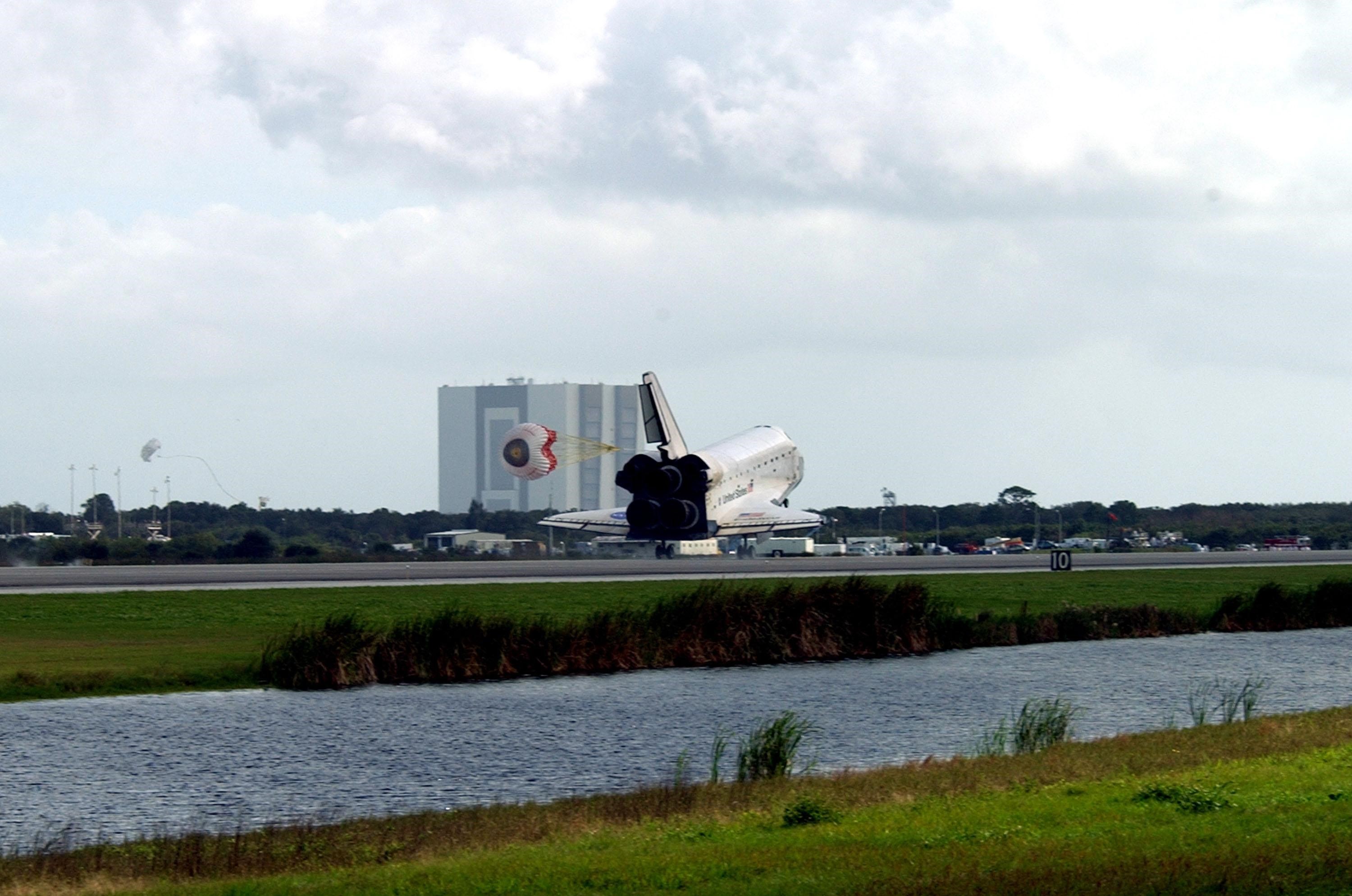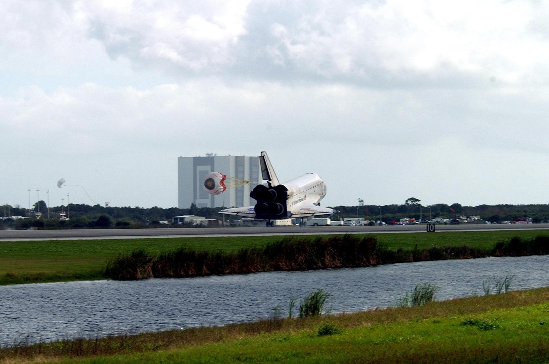 KENNEDY SPACE CENTER, FLA. -- Endeavour's drag chute is deployed as the orbiter touches down on Runway 15 at the KSC Shuttle Landing Facility, completing mission STS-108. After a mission-elapsed time of 11 days, 19 hours and 35 minutes, the landing is the 57th at KSC in the history of the program. Main gear touchdown occurred at 12:55:10 p.m. EST (17:55:10 GMT), nose gear touchdown at 12:55:23 p.m. (17:55:23 GMT) , wheel stop at 12:56:13 p.m. (17:56:13 GMT). STS-108 was the 12th mission to the International Space Station. This mission was the 107th flight in the Shuttle program and the 17th flight for the orbiter. Endeavour carries both the mission crew and the Expedition 3 crew - Commander Frank Culbertson and cosmonauts Vladimir Dezhurov and Mikhail Tyurin - who are returning to Earth after 129 days in space on the Space Station