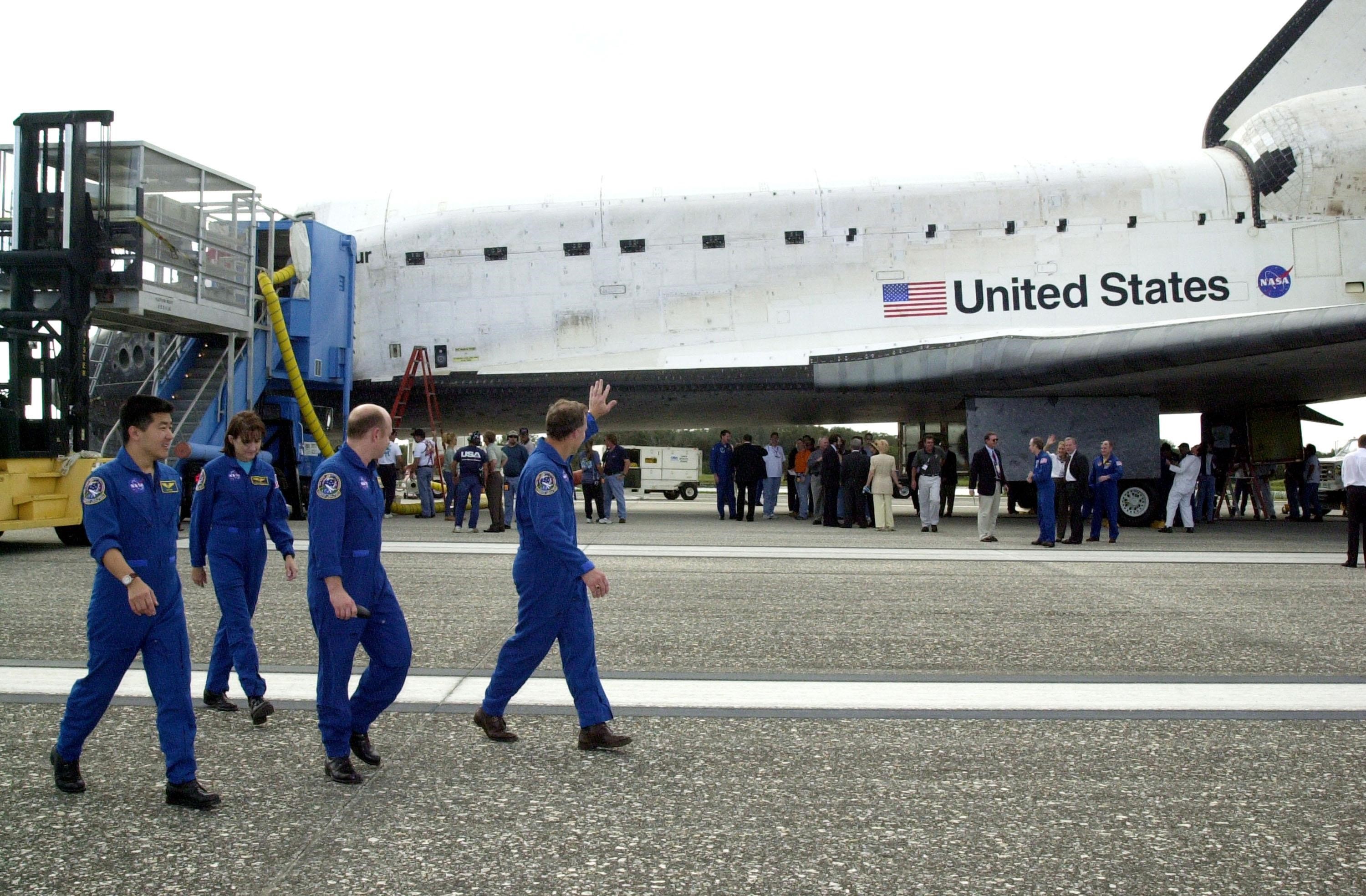 KENNEDY SPACE CENTER, FLA. -- The STS-108 crew wave to the crowd as they head for the van to transport them back to crew quarters. The crew completed their mission with a successful landing on Runway 15 of the KSC Shuttle Landing Facility. The mission had an elapsed time of 11 days, 19 hours and 35 minutes. Main gear touchdown occurred at 12:55:10 p.m. EST (17:55:10 GMT), nose gear touchdown at 12:55:23 p.m. (17:55:23 GMT) , wheel stop at 12:56:13 p.m. (17:56:13 GMT). Rollout distance was 8,941 feet. Endeavour carried both the mission crew and the Expedition 3 crew - Commander Frank Culbertson and cosmonauts Vladimir Dezhurov and Mikhail Tyurin - who returned to Earth after 129 days in space on the Space Station. STS-108 was the 12th mission to the International Space Station. This mission was the 107th flight in the Shuttle program and the 17th flight for the orbiter. The landing is the 57th at KSC in the history of the program