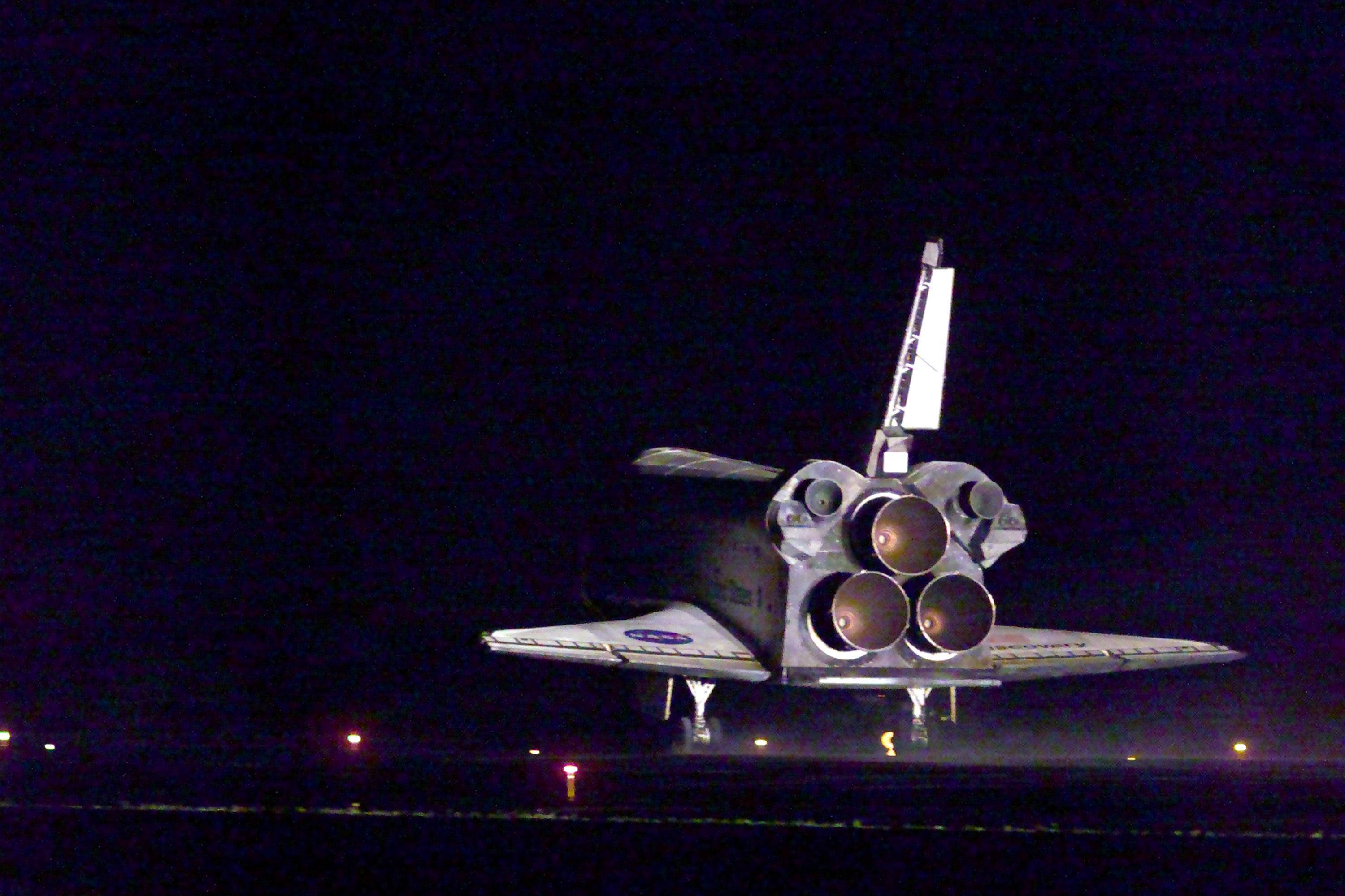 KENNEDY SPACE CENTER, Fla. -- Viewed from behind, Space Shuttle Discovery is seen landing on runway 15 of the KSC Shuttle Landing Facility. Main gear touchdown occurred at 2:31:42 a.m. EST. Nose wheel touchdown occurred at 2:31:54 a.m., and wheel stop at 2:33:06 a.m. The landing on orbit 201 concluded mission STS-102, the eighth flight to the International Space Station, carrying the first Multi-Purpose Logistics Module Leonardo, to the ISS and Expedition Two, a replacement crew for the Station. The 12-day, 19-hour, 51-minute mission returned both the Leonardo and the first resident crew of the ISS, Expedition One, to KSC. Discovery logged 5.3 million miles on this mission. The landing marked the 54th at KSC in the history of the program, and the 12th night landing at KSC