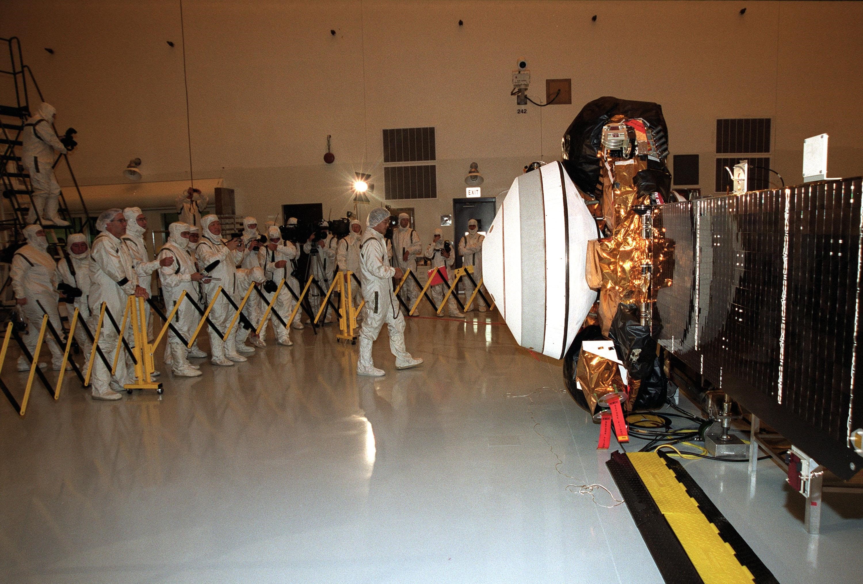 KENNEDY SPACE CENTER, Fla. -- A worker in the Space Assembly and Encapsulation Facility -2 faces the Genesis spacecraft at right as he provides information about it to the media gathered at left. Genesis will capture samples of the ions and elements in the solar wind and return them to Earth for scientists to use to determine the exact composition of the Sun and the solar system's origin. NASA's Genesis project is managed by the Jet Propulsion Laboratory in Pasadena, Calif. Lockheed Martin Astronautics built the Genesis spacecraft for NASA in Denver, Colo. Launch of Genesis aboard a Boeing Delta II rocket is scheduled for July 30 at 12:36 p.m. EDT