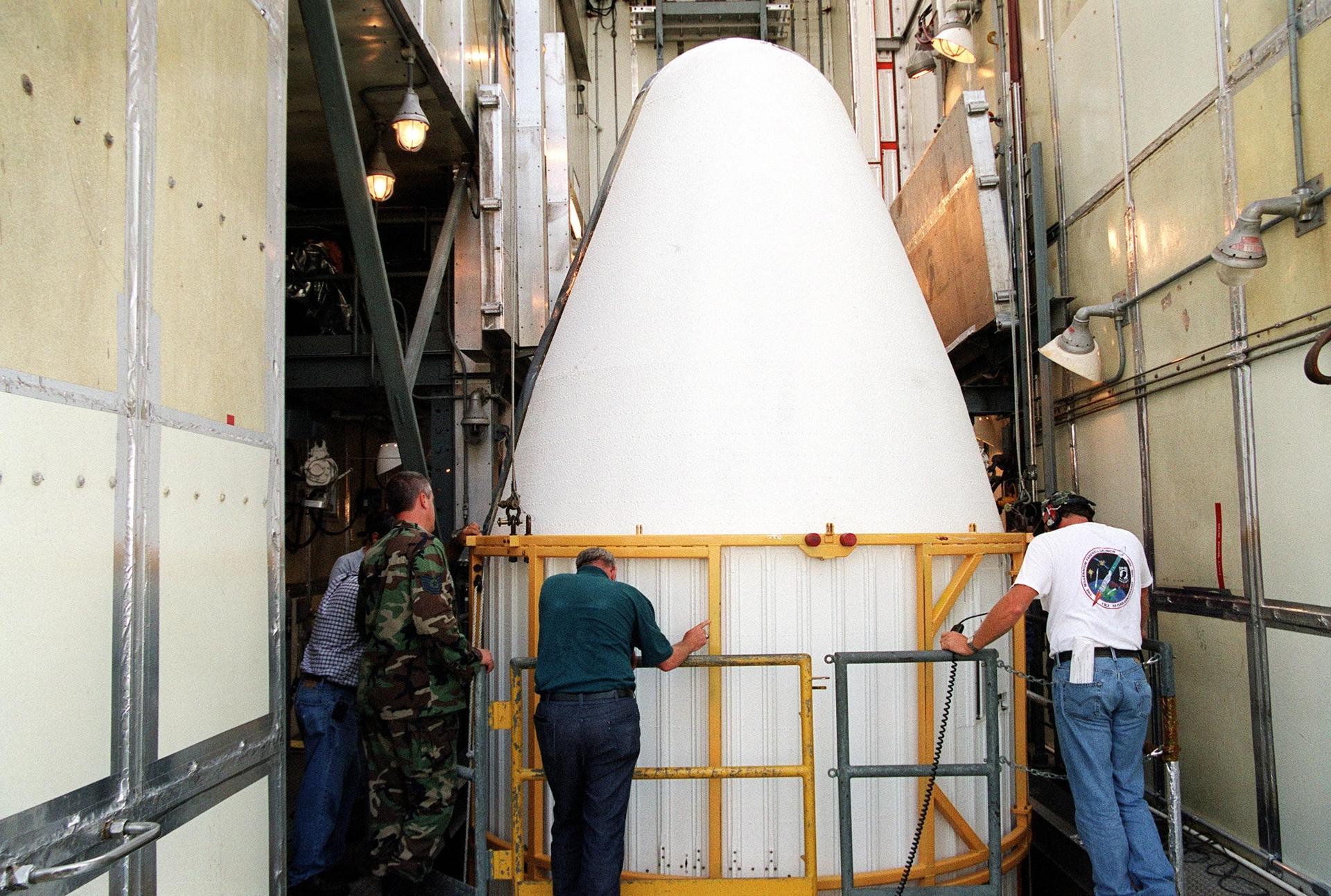 KENNEDY SPACE CENTER, Fla. -- At Launch Complex 17-A, Cape Canaveral Air Force Station, the second part of the fairing for the Genesis spacecraft arrives at the top of the gantry. The fairing will encapsulate the spacecraft to protect it during launch aboard a Delta II rocket. Genesis will be on a journey to capture samples of the ions and elements in the solar wind and return them to Earth for scientists to use to determine the exact composition of the Sun and the solar system’s origin. NASA’s Genesis project in managed by the Jet Propulsion Laboratory in Pasadena, Calif. Lockheed Martin Astronautics built the Genesis spacecraft for NASA in Denver, Colo. The launch is scheduled for July 30 at 12:36 p.m. EDT