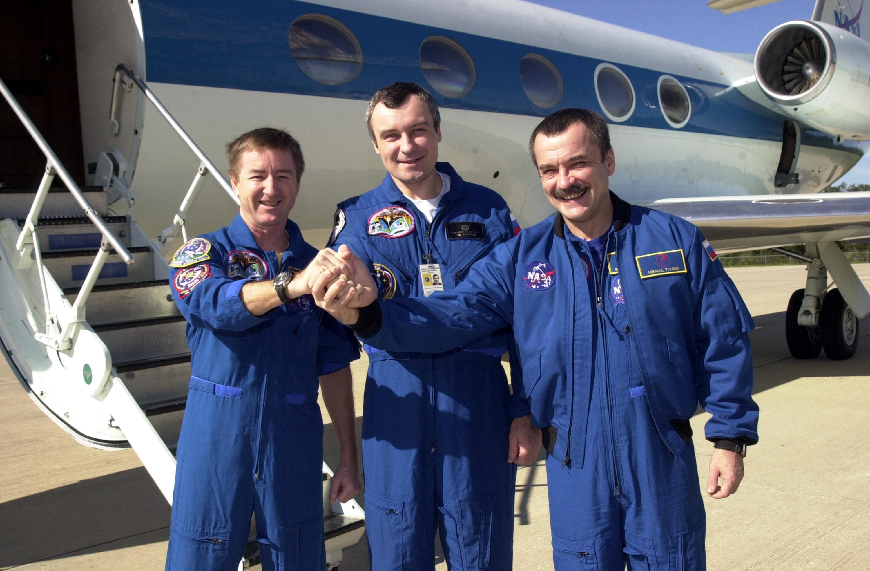 KENNEDY SPACE CENTER, FLA. -- The Expedition Three crew clasp hands in a show of unity before they depart KSC for Houston. From left to right are Commander Frank Culbertson and cosmonauts Vladimir Dezhurov and Mikhail Tyurin. The three returned to Earth as passengers aboard the orbiter Endeavour, which landed at KSC at 12:55 p.m. EST (17:55 GMT) Dec. 17, 2001, after completing mission STS-108. Expedition 3 had spent 129 days on the International Space Station. The landing is the 57th at KSC in the history of the program STS-108 was the 12th mission to the Space Station. This mission was the 107th flight in the Shuttle program and the 17th flight for the orbiter