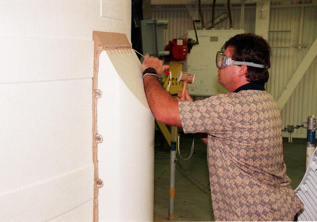 KENNEDY SPACE CENTER, FLA. -- In the Vehicle Assembly Building, Richard Bruns, a United Space Alliance SRB technician, begins to detach the SRB system tunnel cover on the 36 cables inside. The SRB is part of Space Shuttle Atlantis, rolled back from Launch Pad 39A in order to conduct tests on the cables. A prior extensive evaluation of NASA’s SRB cable inventory on the shelf revealed conductor damage in four (of about 200) cables. Shuttle managers decided to prove the integrity of the system tunnel cables already on Atlantis before launching. Workers are conducting inspections, making continuity checks and conducting X-ray analysis on the cables. The launch has been rescheduled no earlier than Feb. 6. <br