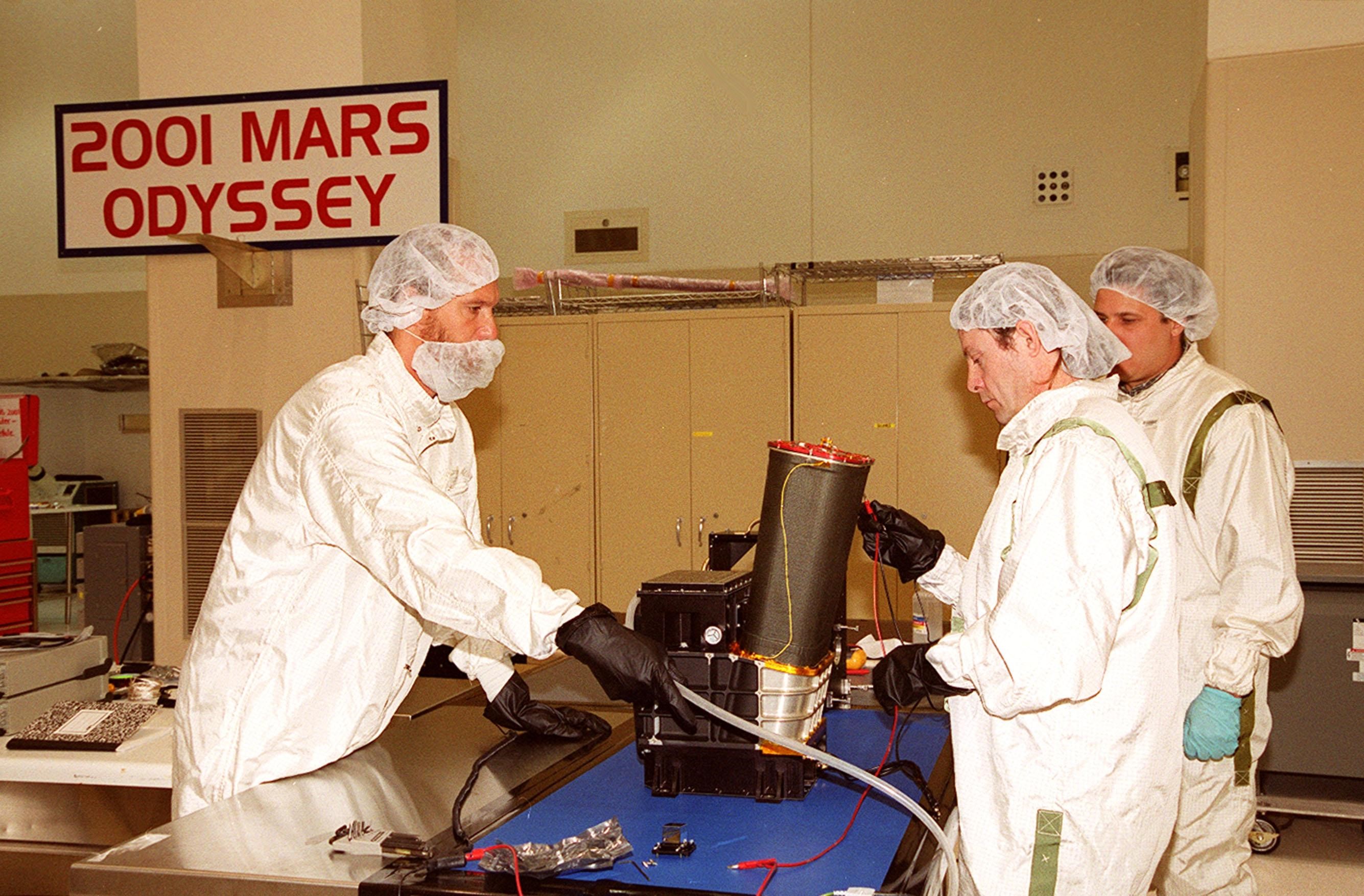 In the Spacecraft Assembly and Encapsulation Facility 2, workers test the Thermal Emission Imaging System (THEMIS) before attaching to the 2001 Mars Odyssey Orbiter. THEMIS will map the mineralogy and morphology of the Martian surface using a high-resolution camera and a thermal infrared imaging spectrometer. The orbiter will carry three science instruments: THEMIS, the Gamma Ray Spectrometer (GRS), and the Mars Radiation Environment Experiment (MARIE). The GRS will achieve global mapping of the elemental composition of the surface and determine the abundance of hydrogen in the shallow subsurface. The MARIE will characterize aspects of the near-space radiation environment with regards to the radiation-related risk to human explorers. The Mars Odyssey Orbiter is scheduled for launch on April 7, 2001, aboard a Delta 7925 rocket from Launch Pad 17-A, Cape Canaveral Air Force Station