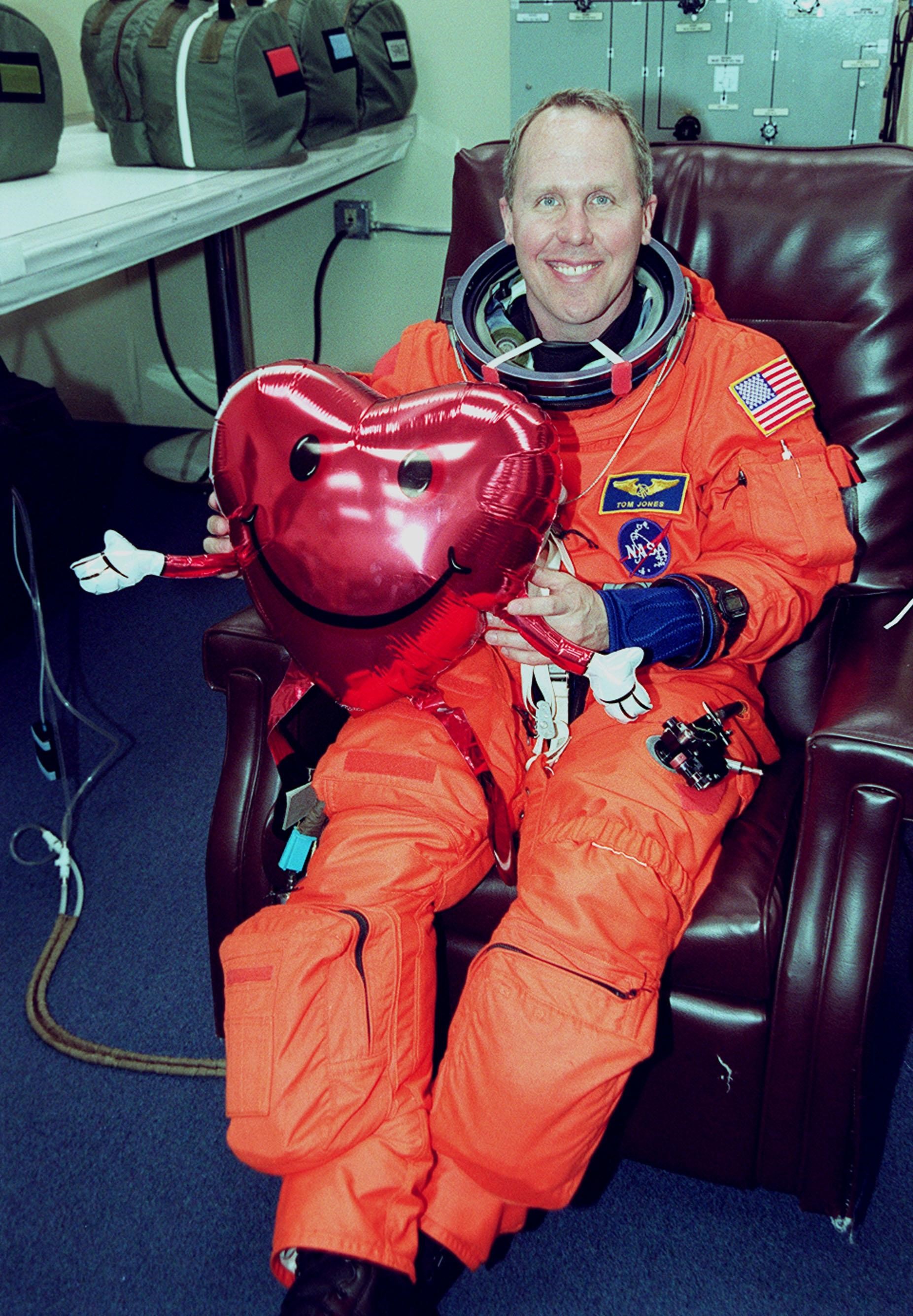 While donning his launch and entry suit, STS-98 Mission Specialist Thomas Jones holds a reminder that the crew will be in space on Valentine’s Day during the 11-day mission. STS-98 is the seventh construction flight to the International Space Station. Atlantis is carrying the U.S. Laboratory Destiny, a key module in the growth of the Space Station. Destiny will be attached to the Unity node on the Space Station using the Shuttle’s robotic arm. Three spacewalks, by Curbeam and Jones, are required to complete the planned construction work during the mission. Launch is targeted for 6:11 p.m. EST and the planned landing at KSC Feb. 18 about 1:39 p.m. This mission marks the seventh Shuttle flight to the Space Station, the 23rd flight of Atlantis and the 102nd flight overall in NASA’s Space Shuttle program