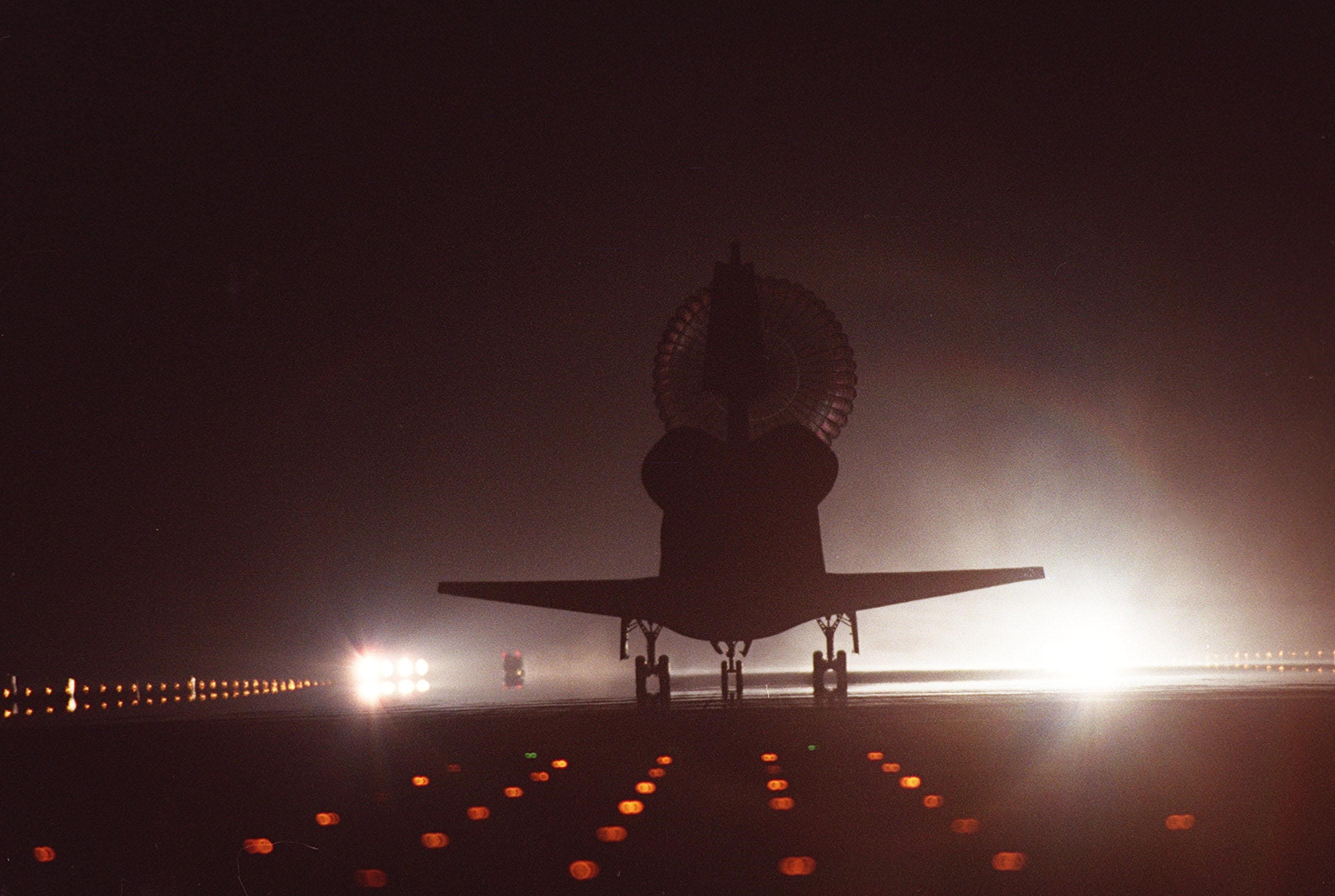 KENNEDY SPACE CENTER, Fla. -- Space Shuttle Discovery is silhouetted by the brilliant runway lights of runway 15 as it lands at the KSC Shuttle Landing Facility. Main gear touchdown occurred at 2:31:42 a.m. EST. Nose wheel touchdown occurred at 2:31:54 a.m., and wheel stop at 2:33:06 a.m. The landing on orbit 201 concluded mission STS-102, the eighth flight to the International Space Station, carrying the first Multi-Purpose Logistics Module, Leonardo, to the ISS and Expedition Two, a replacement crew for the Station. The 12-day, 19-hour, 51-minute mission returned both the Leonardo and the first resident crew of the ISS, Expedition One, to KSC. Discovery logged 5.3 million miles on this mission. The landing marked the 54th at KSC in the history of the program, and the 12th night landing at KSC