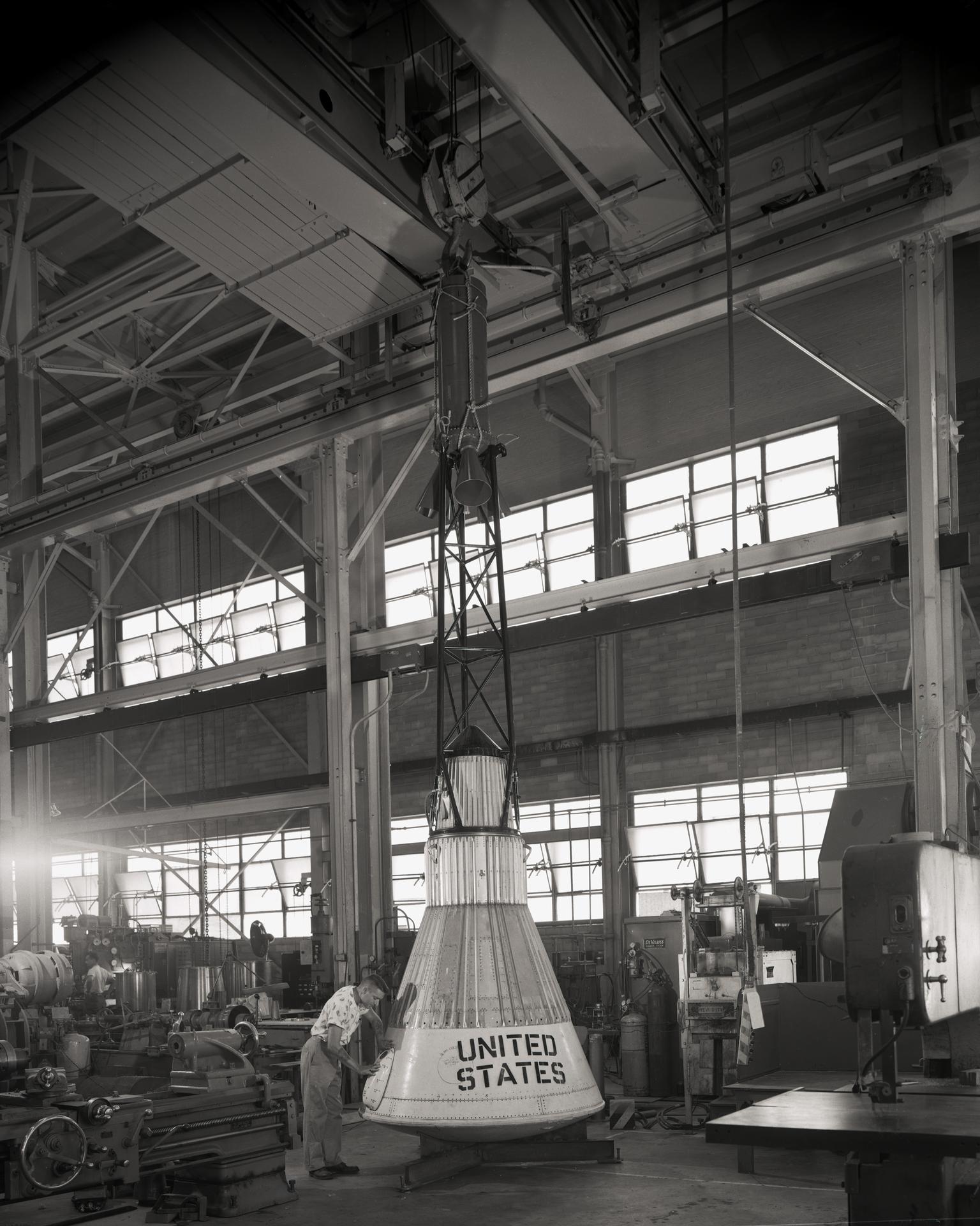 Assembling the Little Joe capsules. The capsules were manufactured in-house by Langley technicians. Three capsules are shown here in various stages of assembly. The escape tower and rocket motors shown on the completed capsule would be removed before shipping and finally assembly for launching at Wallops Island. Joseph Shortal wrote (vol. 3, p. 32): Design of the Little Joe capsules began at Langley before McDonnell started on the design of the Mercury capsule and was, therefore, a separate design. Although it was not designed to carry a man, it did have to carry a monkey. It had to meet the weight and center of gravity requirements of Mercury and withstand the same aerodynamic loads during the exit trajectory. Although in comparison with the overall Mercury Project, Little Joe was a simple undertaking, the fact that an attempt was made to condense a normal two-year project into a 6-month one with in house labor turned it into a major undertaking for Langley. Project Mercury: Little Joe: Boilerplate Mercury spacecraft undergo fabrication at the shops of the Langley Research Center. They will launched atop Little Joe rockets to test the spacecraft recovery systems. -- Published in Joseph A. Shortal, History of Wallops Station: Origins and Activities Through 1949, (Wallops Island, VA: National Aeronautics and Space Administration, Wallops Station, nd), Comment Edition. L59-4947 Technicians prepare a Little Joe launch vehicle prototype for the Mercury space program, 1959. Photograph published in Winds of Change, 75th Anniversary NASA publication, page 76, by James Schultz