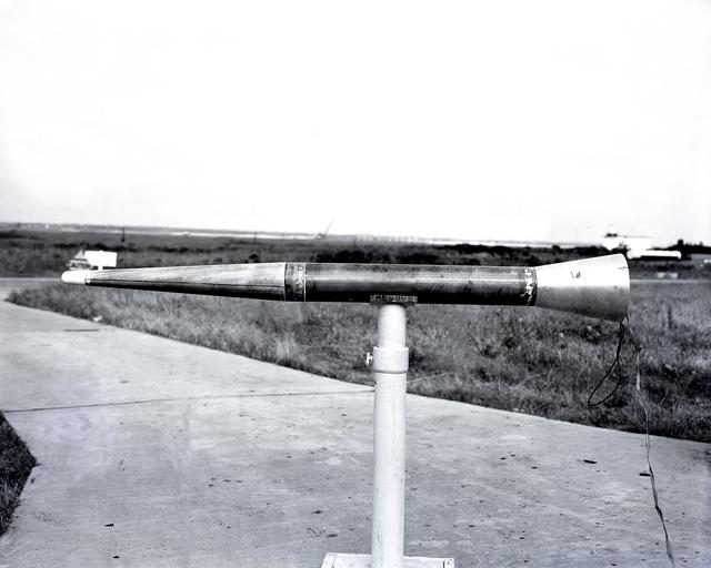 L59-7932 First University of Michigan Strongarm sounding rocket on launcher at Wallops for test, November 10, 1959. Photograph published in A New Dimension Wallops Island Flight Test Range: The First Fifteen Years by Joseph Shortal. A NASA publication. Page 701.E5-188 Shop and Launcher Pictures