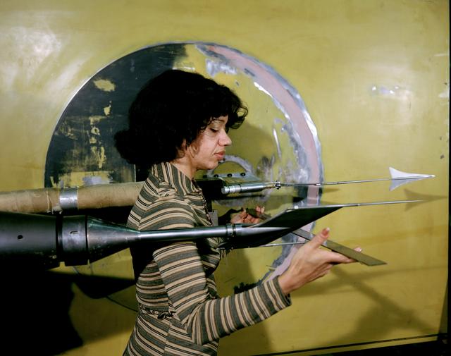 Sonic Boom test model and measuring probe rake with Christine Darden