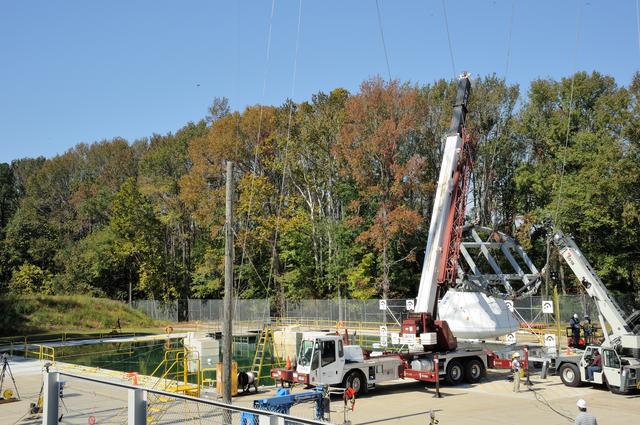 ORION Project-(SPLASH) Structural Passive Landing Attenuation for Survivability of Human Crew (BTA) Boiler Plate Test Article Water Impact Test-Pot Phase"0" Test Tested at the Hydro Impact Basin at the Landing and Impact Research Facility (Gantry)