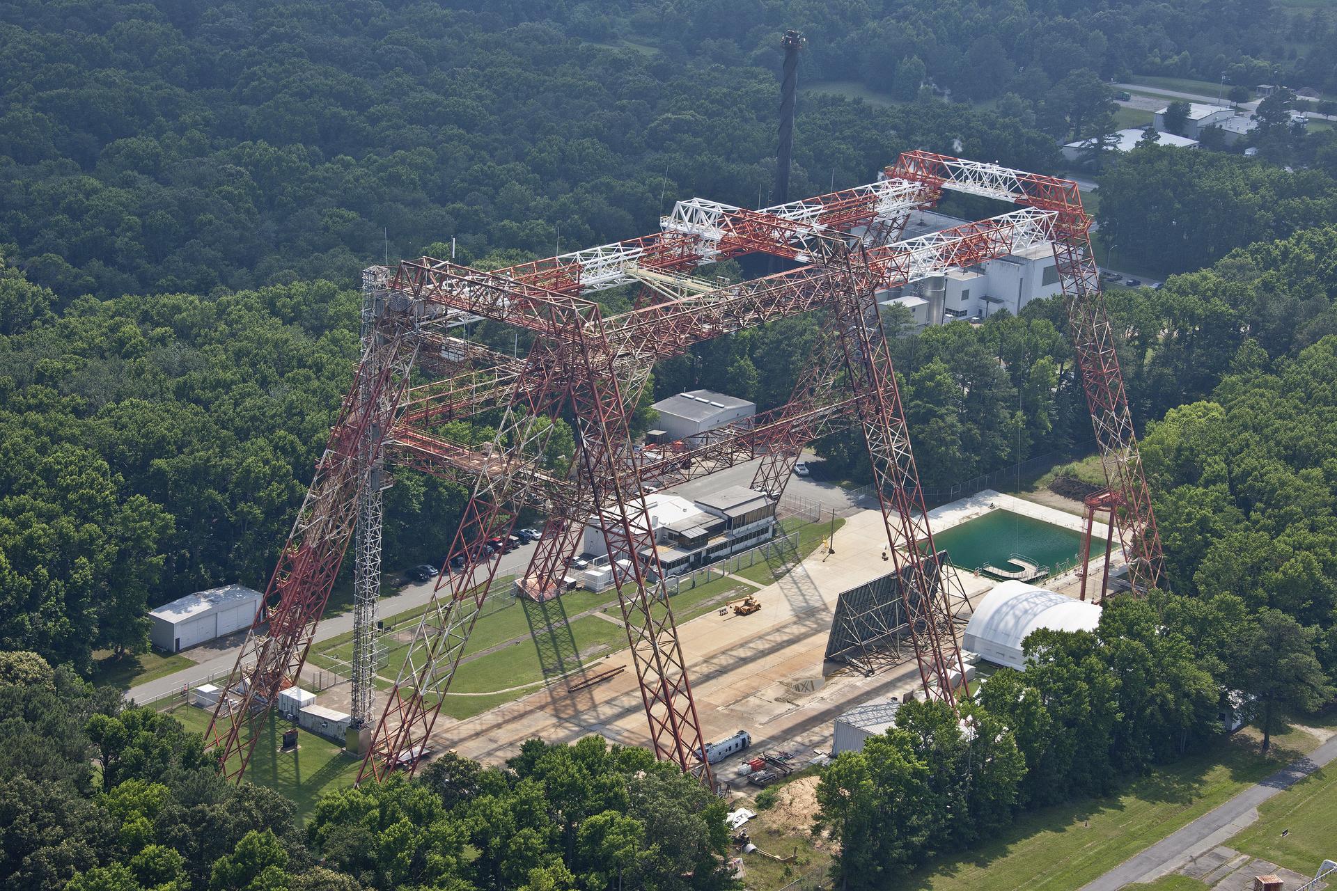 Aerial of NASA Langley's Gantry and slashdown pool also known as Impact Dynamic Faciltiy