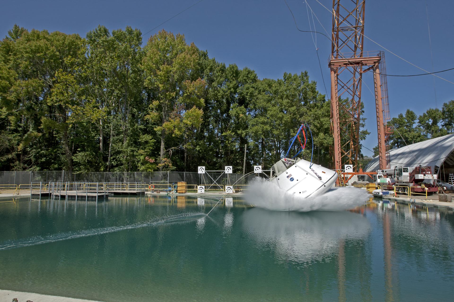 Orion at Hydro Impact Basin Engineers conducted the first test as part of Phase 1 of the Orion boilerplate test article at NASA's Langley Research Center, on Oct. 18.