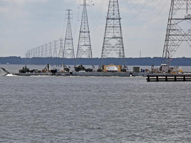 The Orion Test Capsule and a number of other items used in the capsule recovery at being transported down the James River on a Navy INLS "Improved Navy Lighterage System" from Fort Eustis from where it was loaded. Its liquid route will take them to Little Creek Amphibious Base in Norfolk, where it will stay until scheduled recovery test will be performed.