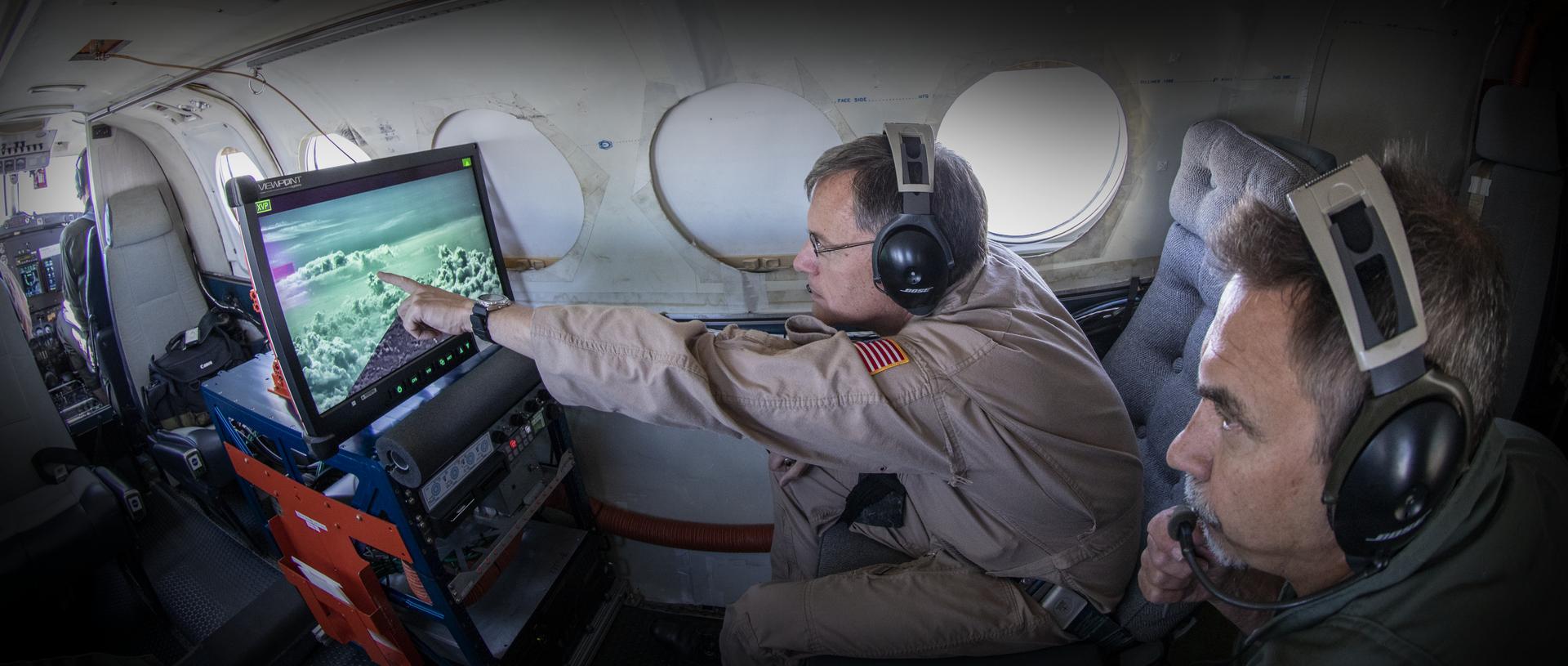 Testing the External Vision System (XVS) software on the B200 King Air. Pilots, Peter Coen and Wayne Ringelberg attempt to spot an incoming aircraft on the XVS monitor.