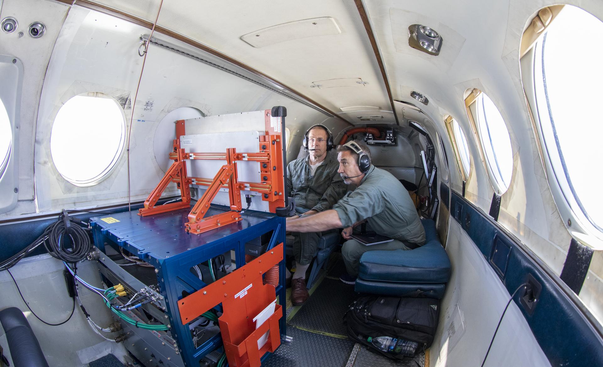 Testing the External Vision System (XVS) software on the B200 King Air. Pilots, Peter Coen and Wayne Ringelberg attempt to spot an incoming aircraft on the XVS monitor.