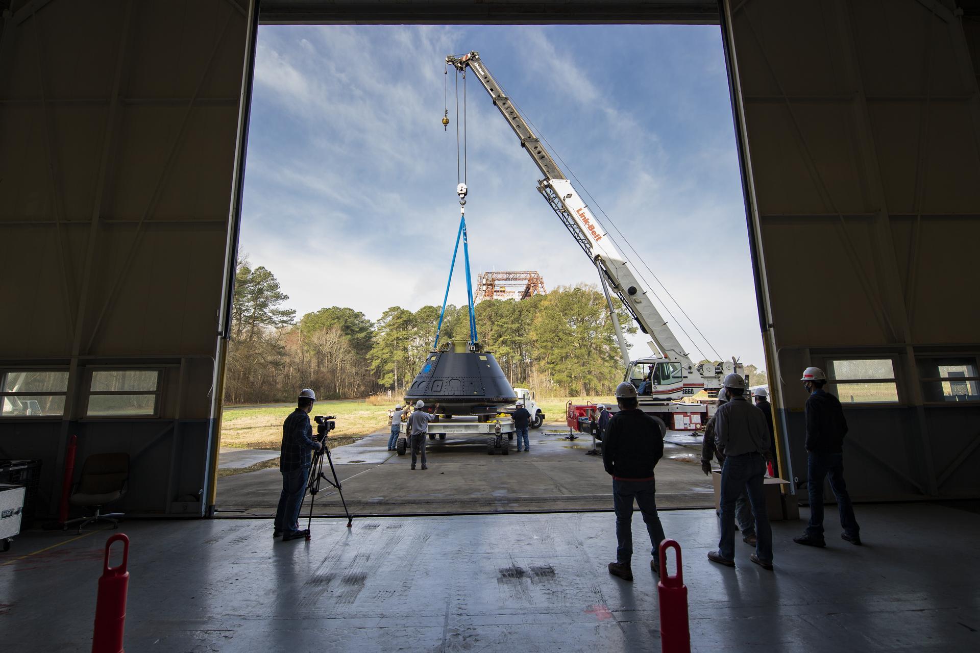 Photos of LaRC team weighting and performing Center of Gravity (CG) measurements of the Structural Test Article (STA) at NASA Langley Research Center.