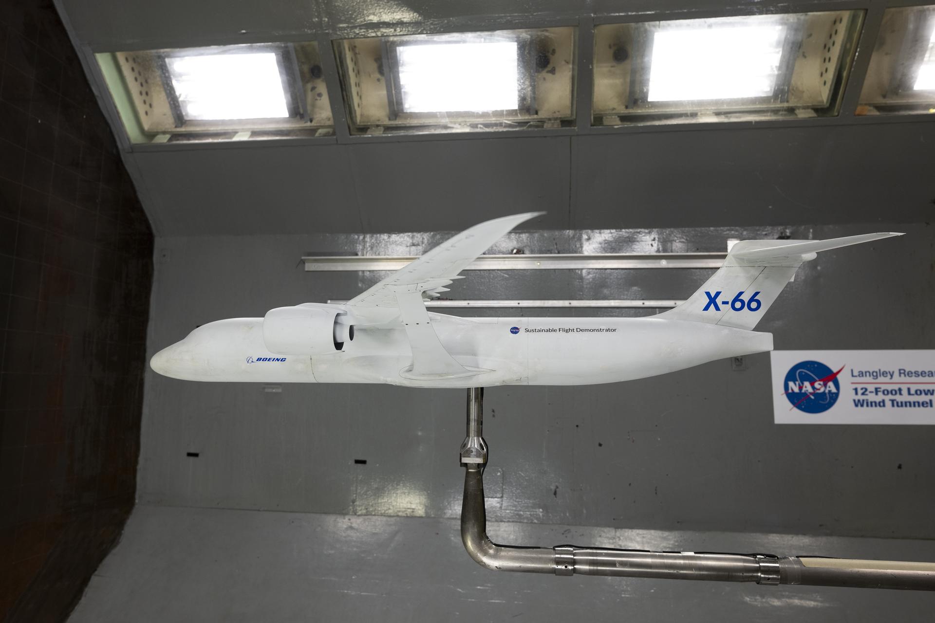 A model of the X-66 aircraft with a wingspan of almost 6 feet was placed in the 12-Foot Low-Speed Wind Tunnel at NASA’s Langley Research Center in Hampton, Virginia on October 30, 2024. During the tests, the team captured measurements of forces such as lift and drag over many aerodynamic configurations and flight conditions.
