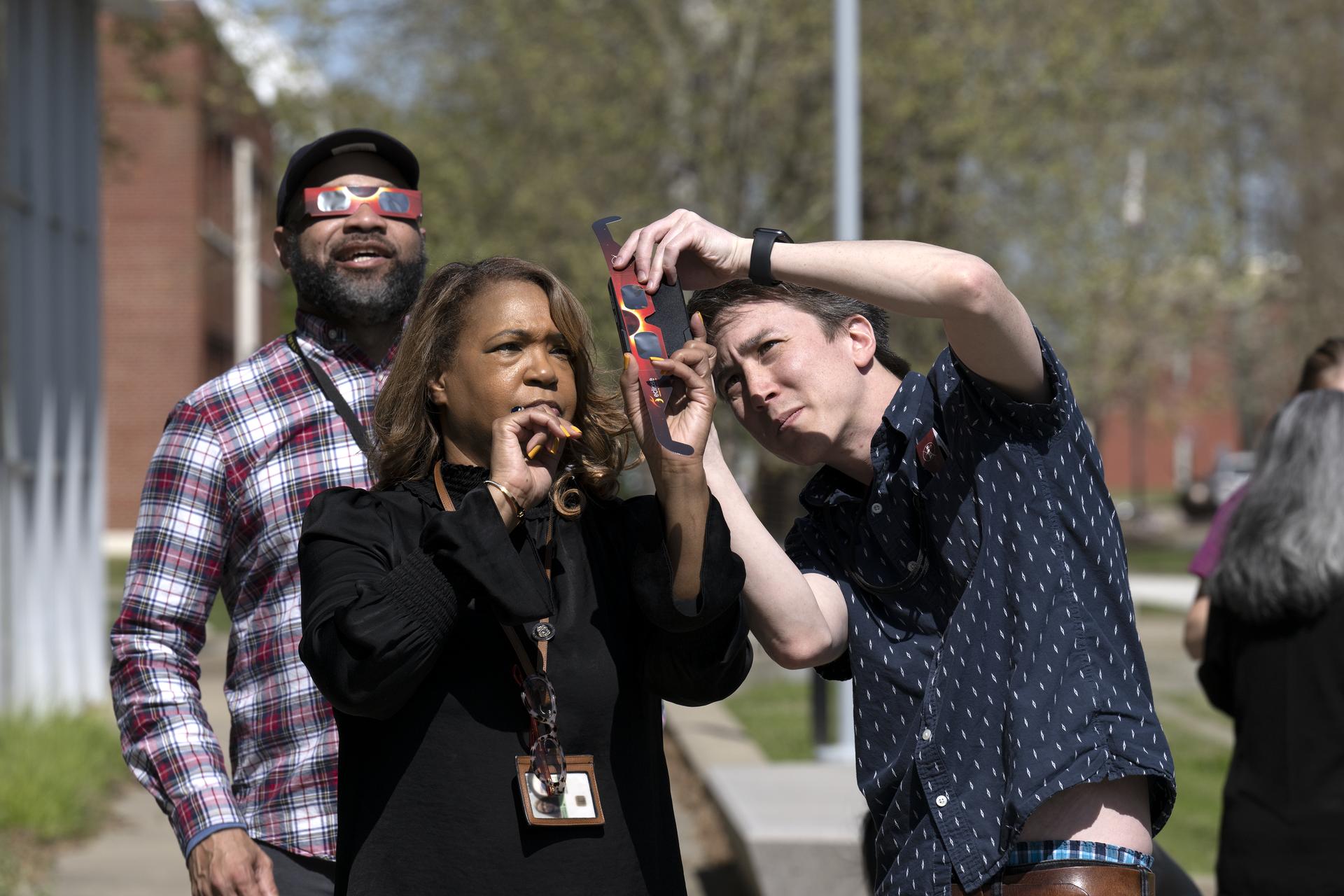 People are seen viewing the partial solar eclipse from NASA Langley Research Center in Hampton, VA, Monday, April 8, 2024. A total solar eclipse swept across a narrow portion of the North American continent from Mexico’s Pacific coast to the Atlantic coast of Newfoundland, Canada. A partial solar eclipse was visible across the entire North American continent along with parts of Central America and Europe. Photo Credit: (NASA/Ryan Hill)