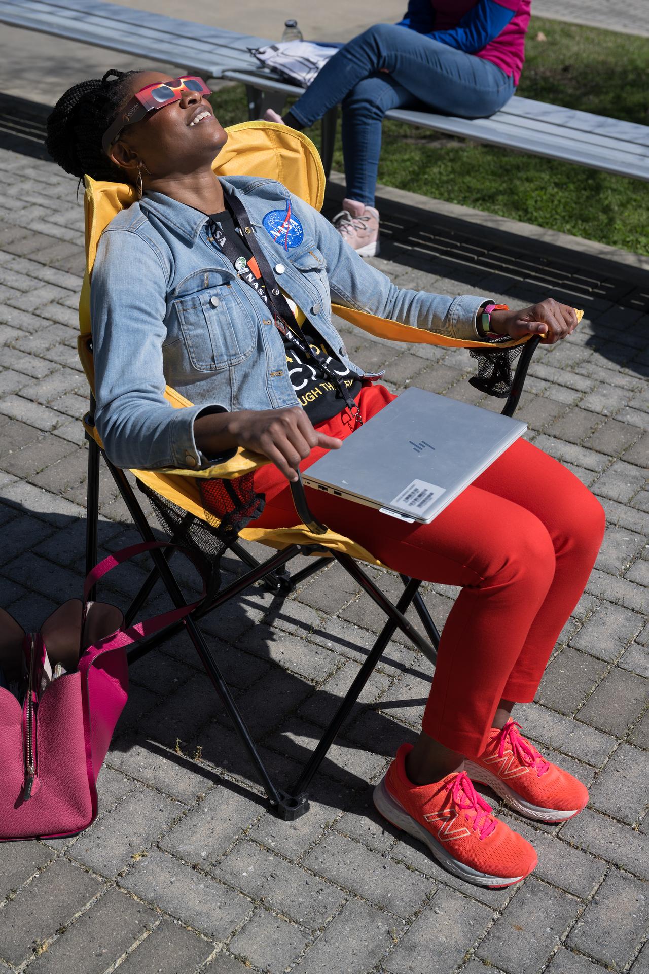 People are seen viewing the partial solar eclipse from NASA Langley Research Center in Hampton, VA, Monday, April 8, 2024. A total solar eclipse swept across a narrow portion of the North American continent from Mexico’s Pacific coast to the Atlantic coast of Newfoundland, Canada. A partial solar eclipse was visible across the entire North American continent along with parts of Central America and Europe. Photo Credit: (NASA/Mark Knopp)