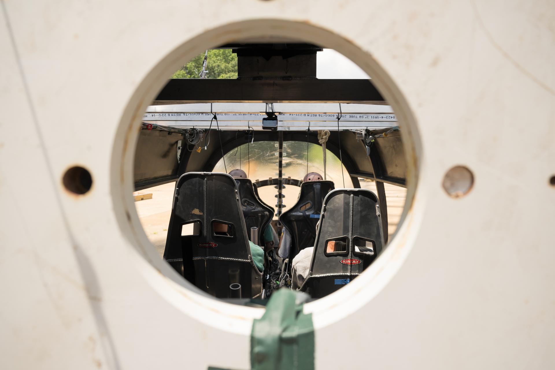 Inside view from the back of an aircraft cabin. The Lift Plus Cruise #2: eVTOL swing and drop test held at the Landing And Impact Research Facility (LandIR), known as the Gantry.